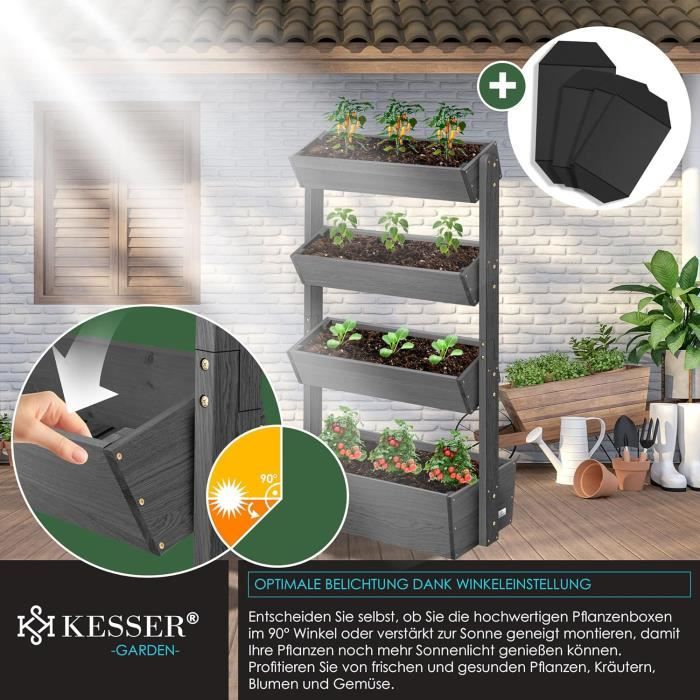 Caractéristiques techniques : Type de montage : autonome , Assemblage requis : oui , Style : moderne Jardinière surélevée verticale avec bac à plantes, design à 3 niveaux pour économiser de l'espace, idéal pour balcon, rebord de fenêtre et terrasse Couleur : blanc/gris, blanc , Matériau : PP, fer Dimensions du colis : 76,5 x 31,5 x 28 cm., Poids brut : 6 kg., Poids net : 5,7 kg. Design de grande capacité : il contient un total de 3 pots de fleurs (taille de 71 x 17 x 15 cm, chaque capacité de 14 gallons) qui vous permet de faire pousser plusieurs plantes en même temps et de profiter pleinement de l'espace efficace. Pot De Fleurs à étages Pour Balcon Jardin Surélevé Jardinière Verticale 6 Bacs COSTWAY - Lit De Modulable Pour Balcon Et Terrasse Lit Jardin Vertical Diy Support De Plantes Vertical Terrasse Extérieur Procédé : moulage par injection Contenu : 1 jardinière surélevée à 3 niveaux avec 3 pots de fleurs. Solide et durable : fabriqué en polypropylène de haute qualité après le processus de moulage par injection, il est résistant aux chocs, à la corrosion et à l'usure, avec une forte capacité de charge et une longue durée de vie. Capacité de charge totale : environ 100 kg. Jardinière Surélevée à Roulettes Avec Treillis Obélisque Lit De Jardin A Arrosage Automatique Avec 3 Hauteurs 42 X 42 X 92634662 Capacité du pot individuel : 20 l Il est équipé de 3 bacs à plantes séparés, permettant une culture organisée de légumes, herbes, fleurs, et plus encore sans interférence. Construit en bois de pin robuste et fiable, cette unité apporte une ambiance chaleureuse et rustique à tout espace extérieur ou intérieur