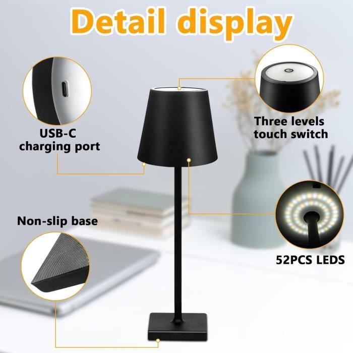 EN STOCK : Lampe de table sans fil, lampe sans fil rechargeable dimmable 5200 mah, lampe exterieur étanche ip54, doré pas cher - Retrait & Livraison - Paiement 4X disponible. Bureau à prix discount 【Étanche IP54】Ces lampes de table à piles sont fabriquées avec un revêtement en aluminium mat et un abat-jour en acrylique et promettent une qualité durable. Lampe De Table Rechargeable Noire, Lampe De Table Sans Fil, Lampe De Table Rechargeable Noire Lampe De Table Sans Fil Lampe De Table A Intensite Variable Tactile Multicolore Rvb Pour Restaurant Lampe De Table De Chambre A Coucher Lampe De Bureau Lampes Poldina lampe de bureau poldina lampe lampe poldina lampe sans fil lampes sans courant 【Lampe de table à batterie LED】Lampe de table sans fil Batterie intégrée rechargeable de 5200 mAh. Léger et portable, c'est l'idée cadeau parfaite et crée une atmosphère romantique pour vos proches. Lampe de bureau LED rechargeable par USB, alimentée par une batterie de 1200 mAh, commande tactile, 6 niveaux de luminosité réglables. Vendu par Rafim store ZOLGINAH Lampe De Chevet LED Sans Fil Rechargeable, Lampe De Table Led Sans Fil Rechargeable Lampe De Bureau Alimente Par Batterie 5200mah Lumire Portative En Mtal Usb Mini Petite Lampe De Chevet Pour Restaurant Extrieur Bar Caf Noir 56230030 La lumière chaude peut être atténuée de manière continue de 5 % à 100 % et s'adapte donc à différentes situations. Le degré d'étanchéité IP54 garantit une transition sans solution de continuité entre une utilisation intérieure et extérieure, tandis que la base antidérapante assure la stabilité. Lumière RGB et chaude : changez la couleur en tournant l'anneau coloré sur le dessus de la lampe de bureau à LED.