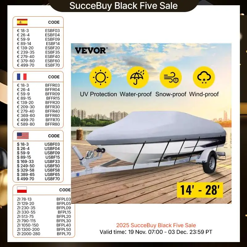 Ajustement universel : Conçue for s'adapter aux bateaux à coque en V de 14 à 28 pieds, cette housse est polyvalente for différentes tailles et formes CaractéristiquesModèle : Housse de bateau 17-19Convient for : bateau de 17 à 19 piedsLongueur : 17'-19'/ 518 cm -579 cmLargeur du faisceau : jusqu'à 102/ 259 cmMatériau : tissu Oxford 210DContenu du paquet1 x Housse de bateau1 x sac de rangement5 sanglesCaractéristiquesModèle : Housse de bateau 25-28Longueur : 25'-28'Largeur du faisceau : jusqu'à 118Matériau : tissu Oxford 210DContenu du paquet1 x Housse de bateau1 x sac de rangement5 x sanglesCaractéristiquesModèle : Housse de bateau 20-22Longueur : 20'-22' / 610 cm-670 cmLargeur du faisceau : jusqu'à 106 / 269 cmMatériau : tissu Oxford 210DContenu du paquet1 x Housse de bateau1 x sac de rangement5 x sanglesCaractéristiquesModèle : Housse de bateau 14-16Longueur : 14'-16'/427 cm -488 cmLargeur du faisceau : jusqu'à 90/ 229 cmMatériau : tissu Oxford 210DContenu du paquet1 x Housse de bateau1 x sac de rangement5 sangles Protection toutes saisons : offre une protection complète contre la pluie, la neige, le vent et les rayons UV, garantissant que votre bateau reste impeccable Tissu Oxford Marine Bache Bateau Housse De Protection Imperméable For Bateau Housse Protection Bateau La housse de bateau s'adapte aux bateaux de 16 à 18,5 pieds avec un tissu 600D de qualité marine, offre une imperméabilité, une protection UV et un ajustement parfait avec des sangles réglables Acheter housse console de protection bateau gris Lazilas | Bache bateau... Bâche de protection pour bateau imperméable 530x290cm - Sport