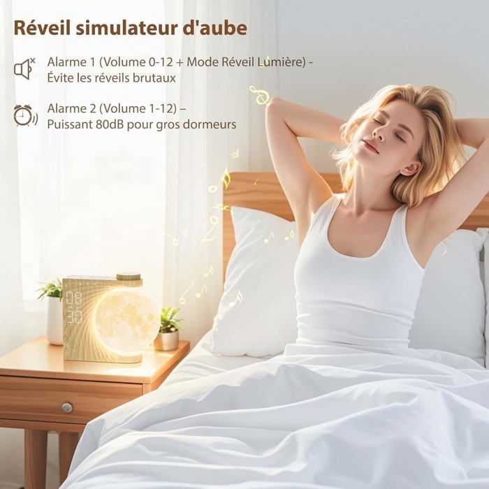 𝗙𝗼𝗻𝗰𝘁𝗶𝗼𝗻 𝗦𝗻𝗼𝗼𝘇𝗲: Appuyez sur le bouton pour gagner 10 minutes de sommeil supplémentaires — idéal pour les grasses matinées ! Mode d'emploi et remarques importantes Bouton SNOOZE - Presser brièvement pour ajuster la luminosité de l'affichage Contenu de la livraison - Adaptateur secteur européen ×1, câble USB 1,5m ×1, notice d'utilisation en français ×1., Optimisation - Veuillez suivre les instructions du manuel pour toutes les fonctions. 𝗗𝗲𝘀𝗶𝗴𝗻 𝗟𝘂𝗻𝗮𝗶𝗿𝗲 É𝗹é𝗴𝗮𝗻𝘁: Lampadaire 3D avec 8 couleurs d'ambiance et luminosité réglable. Fonction Reveil Simulateur d'aube - Le réveil lumineux et l'option Silencieux ne sont disponibles qu'en Mode Réveil 1., Indicateur de réveil - Le symbole lumineux indique que le Réveil 1 est activé (même principe pour le Réveil 2). Réveil Simulateur d'Aube Pour Enfants Parfaitement lisible de jour comme de nuit. 𝗔𝗺𝗯𝗶𝗮𝗻𝗰𝗲 𝗦𝗼𝗻𝗼𝗿𝗲 𝗔𝗽𝗮𝗶𝘀𝗮𝗻𝘁𝗲: Profitez de 10 sons naturels (pluie, vagues, oiseaux., ., ., ) avec minuterie réglable (30/60/90 min). Sons apaisants : 10 bruits naturels pour vous accompagner vers le sommeil. Laissez-vous bercer par ces mélodies relaxantes et endormez-vous plus rapidement. Fonction minuterie intégrée pour une extinction automatique - pratique et économique Simulateur D'aube RETEYUNG Réveil Veilleuse Enfant - Simulateur D'Aube, 15 Veilleuse Enfant Multifonction 𝗠𝘂𝗹𝘁𝗶𝗳𝗼𝗻𝗰𝘁𝗶𝗼𝗻 𝗩𝗲𝗶𝗹𝗹𝗲𝘂𝘀𝗲: Combine réveil, horloge LED, lampe de chevet et générateur de bruit blanc. Attention - Rotation manuelle uniquement (pas de fonction automatique). Comparez RETEYUNG Veilleuse Réveil Enfant, Simulateur d'Aube 3D Lune Rotative, 8 Couleurs RGB, 10 Sons Naturels, Snooze Idéal Cadeau chez Alimentation - L'appareil doit être branché sur secteur (non rechargeable). Utilisable jusqu'à 3 fois de suite. Attention - Rotation manuelle uniquement (pas de fonction automatique) Apprécié par les femmes, les hommes, les adolescents et les enfants.