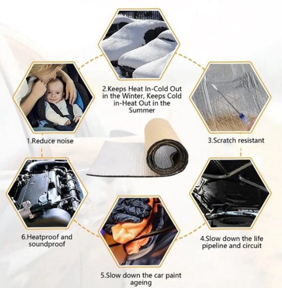 Idéal pour les utilisateurs de bricolage : rapide, pratique et efficace. Idéal pour une expérience de conduite calme et confortable., Fonctions et avantages : 1., Matériau de haute qualité, durable et sûr : la surface du tapis isolant est fabriquée en film d'aluminium imperméable avec des propriétés anti-humidité et anti-odeurs. Nos moquettes d’isolation phonique sont conçues pour offrir une excellente réduction sonore. Avec une densité élevée et une conception multicouche, elles garantissent une isolation optimale contre les bruits extérieurs Emballage pratique : la livraison comprend 10 tapis d'isolation autocollants. La taille unique est de 40 x 25 cm (environ 15,74 x 9,84 pouces), disponible avec une épaisseur de 5 mm ou 10 mm. Cela permet de couvrir plusieurs zones critiques dans le véhicule, ce qui améliore considérablement le calme et le confort à l'intérieur Caractéristiques du produit : Matériau : film d'aluminium + composite de caoutchouc Taille par pièce : 40 x 25 cm / env., 38 x 24 cm. Isolation Phonique Voiture Tapis D'Isolation Phonique Pour Voiture Emballage pratique : la livraison comprend 10 tapis d'isolation autocollants. Cela permet de couvrir plusieurs zones critiques dans le véhicule, ce qui améliore considérablement le calme et le confort à l'intérieur. Isolant Voiture IIRC Lot De 10 Tapis D'isolation Phonique Universels Pour Voiture, 40 X 25 Cm, 5 Mm/10 Mm, Tapis D'isolation Acoustique, Autocollants, Insonorisants, Imperméables, Ignifuges (10mm Isolant Acoustique Voiture Il est résistant à la plupart des liquides, empêche la formation de moisissures et résiste aux rayures. Caractéristiques du produit : Ce tapis isolant autocollant est fabriqué en aluminium et en caoutchouc composite de haute qualité et offre une excellente isolation phonique, absorption des chocs et isolation thermique. Cela crée un climat intérieur agréable dans le véhicule – chaud en hiver, frais en été.