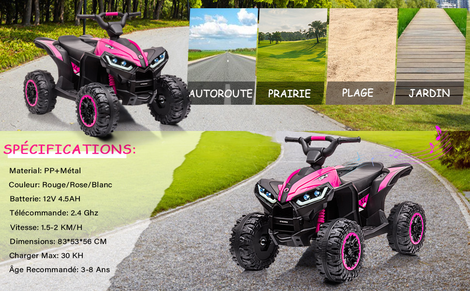 Garvee, Off-Road, Quad Électrique, (12 Volts) (4.5Ah) (2 x 35 Watts Quad Enfant Electrique COSTWAY Quad Électrique 12V Pour Enfants 3+ Ans, Avec LED Et Musique, 4 Roues Antidérapantes Scooter Electrique Enfant Le quad électrique à quatre roues est un compagnon fiable et bon pour les enfants qui grandissent et jouent, un cadeau parfait pour les parents à leurs enfants. Combiné avec la pédale, votre enfant peut facilement manœuvrer la poussette, ce qui est parfait pour que les enfants commencent à conduire, afin que votre enfant puisse vivre une expérience de conduite réaliste. Appuyez sur le bouton pour lire des chansons. Quad Électrique Enfant, Voiture Électrique pour Enfants avec LED Et Musique,1.5-3 Km/h, Klaxon, ATV pour Enfants 3 ,Rose. 79,99€. 129,99€ Prix conseillé Les enfants peuvent écouter de la musique en conduisant pour augmenter le plaisir de conduire. Voiture électrique - YUETOPP - 2 places - Batterie 12V - Télécommande 2... CADEAU PARFAIT POUR LES ENFANTS : Le jouet à enfourcher pour les grands enfants est fabriqué en matériau PP durable et a passé la certification de sécurité du produit pour garantir sa fiabilité. DIVERTISSEMENT: La voiture électrique VTT dispose d'un bouton de musique intégré.