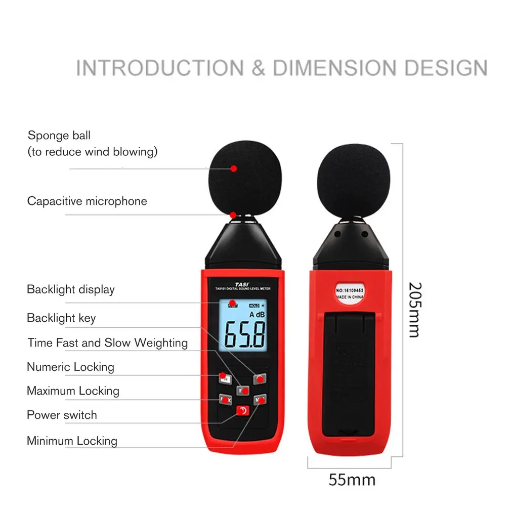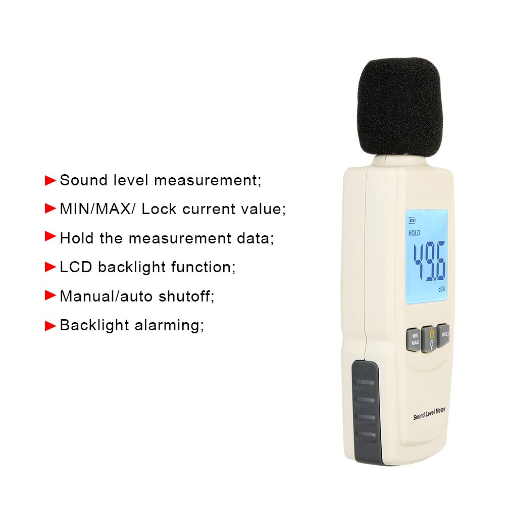 Description de Sonomètre numérique DM1306D, détecteur de bruit mural intelligent, moniteur de température et d'humidité 30-130 dB Méthode d'affichage : écran LED Remarque : en raison de la luminosité et de la résolution de l'écran, la couleur réelle de l'article peut être légèrement différente de celle de la photo. Appareil Mesure Décibel Professionnel Mesure Du Son DM1306D Digital Decibel Sound Meter Détecteur De Bruit Mural Intelligent Portable 30-130dB Avec Moniteur De Température Et D'humidité Sonomètre écran LED Portable dieyyuca Température de stockage : -10 °C à 60 °C. Méthode d'affichage : écran LED Pression atmosphérique : 86 Kpa – 106 kpa Les détecteurs de bruit muraux permettent de surveiller le niveau sonore en temps réel dans les usines et les bureaux, avec une plage de 30 à 130 dB. Ils sont donc parfaits pour la sécurité industrielle et la maîtrise du bruit au travail. Leur conception murale est facile à installer MÈTRE DE BRUIT Numérique Sonomètre Portatif DB Mètre Pondéré A 30-130dB Dimensions : 270 x 90 x 35 mm Contenu du packaging : 1 x jauge de décibel. L'erreur de mesure autorisée est de +/- 1 à 3 cm. Alimentation : batterie au lithium capacité de 2000 mAh.