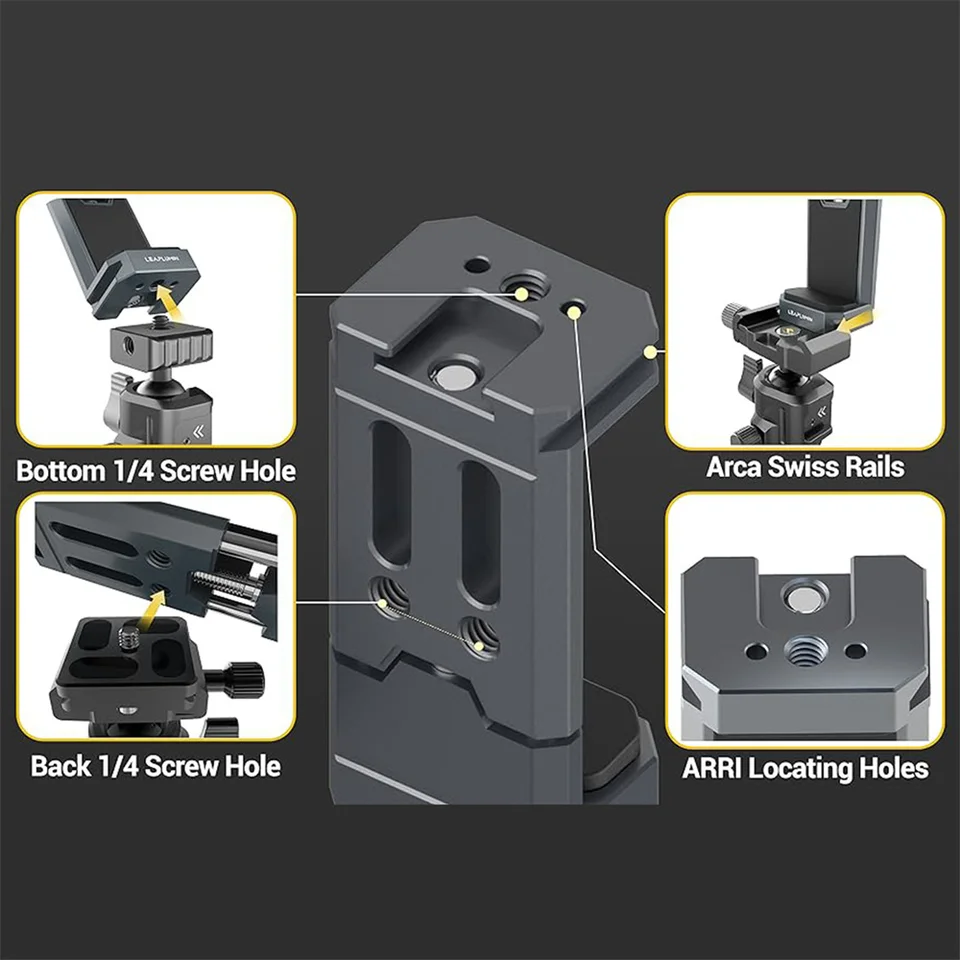 Trépied Téléphone Leaplumin Support De Téléphone En Aluminium Pour Trepied Smartphone Support Universel En Aluminium Pour Trépied De Téléphone Avec Support Réglable Pour IPhone Samsung Design entièrement en alliage d'aluminium : fabriqué en alliage d'aluminium de qualité supérieure pour fournir une durabilité incomparable pour un usage quotidien. Leaplumin HY-A1 offre des trous de vis de 11,4 cm et 2 chaussures froides vous permettant d'explorer les possibilités infinies de prise de vue vidéo. Double sabot froid 11,4 cm vis coulissantes Cold Shoe Arca Swiss Rail ARRI Localisation Trous Leveler Full Aluminium Alloy Body Extensibilité inégalée] - Le support de trépied pour téléphone Leapln HY-A1 offre une extensibilité inégalée en fournissant des vis de 10,2 cm pour connecter des bras magiques et 2 chaussures froides pour fixer des panneaux lneux LED ou des microphones [Base à dégagement rapide Arca Swis] – Le rail Arca Swiss permet un montage et une libération rapides du trépied de l'appareil photo. Anneau de Lumière LED avec Trépied et Support pour Téléphone, Réglable... [Chaussure froide coulissante] - La chaussure froide coulissante sur le dessus vous permet d'ajuster facilement la longueur sans interférer avec les kits attachés. Et l'interface de montage polyvalente vous permet de monter facilement cette pince de téléphone sur les trépieds d'appareil photo, les trépieds de bureau ou même les poignées de l'appareil photo, ce qui la rend parfaite pour la photographie professionnelle, les sessions de jeu en direct, l'hébergement d'un podcast, la conduite de réunions virtuelles ou la création de vlogs.