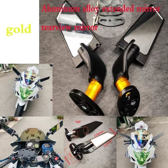 Sa lentille, plus petite que celle d'origine, confère à votre moto un look agressif et sauvage sur route. Conception robuste en aile, adaptée à la plupart des motos sportives. 【Objectif grand angle convexe haute résolution】 : Le champ de vision du rétroviseur d'extrémité de guidon est 30 % plus large que celui des objectifs classiques, éliminant ainsi les angles morts. 【Réglage continu à 360°】 : La rotule du rétroviseur latéral rotatif pour moto permet une rotation à plusieurs angles et permet de basculer facilement entre les modes marche arrière et aile fixe selon la situation de conduite. Robustes et durables, ils ne se plient ni ne se déforment facilement. Conception aérodynamique discrète] : Fermé, le design invisible en forme d'aile du rétroviseur réduit la traînée. Déplié, il offre une vue arrière... Retroviseur Moto Universel CNC Rétroviseurs Latéraux Moto Pour Embouts De Guidon 7/8 22mm Compatibles Avec Vélo Moto Scooter électriques Z1000 Z750 FZ6 SV650 SV1000 CB1000R CBF125 Monster M696 821 Le réglage du champ de vision est également plus convivial Grâce aux adaptateurs 8 mm/10 mm, la conception modulaire ne nécessite aucun réglage et l'installation s'effectue en seulement 3 minutes, ce qui est facile, même pour les débutants L'état de la route arrière est clairement visible d'un seul coup d'œil, de nuit comme dans les virages, ce qui améliore considérablement la sécurité de conduite L'angle d'inclinaison de 25° optimise l'appui à haute vitesse et améliore la maniabilité et l'impact visuel Miroirs Moto Grand Angle Rétroviseurs Rotatifs Réglables Avec Aile De Vent Modifiée Pour Moto Honda Compatible Avec Les Miroirs Guidon Moto Sportive Rétroviseurs moto réglables et rotatifs à 360, rétroviseurs latéraux Stealth Wind Wing, rétroviseurs universels rotatifs pour moto en extérieur. Caractéristiques : 1 Contenu : 1 paire de rétroviseurs 2 coussinets 6 vis 1 clé Remarque : Veuillez vérifier les spécifications des trous de fixation avant l'achat si votre moto n'est pas répertoriée. Tournez le rétroviseur pour trouver la position souhaitée. Spécifications correctes = ajustement parfait Double rotation réglable à 360 degrés. Matériau : Ces rétroviseurs moto sont fabriqués en aluminium usiné. Il offre d'excellentes performances même dans des conditions climatiques extrêmes et ne se déforme pas et ne rouille pas, même après une utilisation prolongée