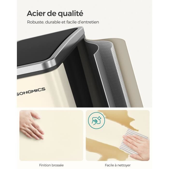 Elle convient aussi bien pour les espaces extérieurs tels que les terrasses, les jardins ou les arrière-cours, ainsi que pour les intérieurs tels que la chambre à coucher, le salon et la salle à manger. Organisation pratique des déchets : avec un système de tri intelligent à double séparation des compartiments, cette poubelle peut simplifier la gestion des déchets secs et humides pour une élimination efficace et une organisation facile Simplifiez votre élimination des déchets sans effort. Compagnon fonctionnel et décoratif, elle améliore l'ambiance dans la cuisine et la salle de bain grâce au tri des déchets peu encombrant. Facile à nettoyer : les matériaux robustes de la poubelle double résistent aux taches et à la décoloration pour une durabilité accrue. Couvercle Bouton-pression Fermeture Douce SWANEW Poubelle De Cuisine, 42L Système De Tri Des Déchets 3 Compartiments Poubelle De Cuisine Rangement Déchets Recyclage Cuisine Liste des produits : 1 poubelle double Remarque : En raison des différences d'éclairage et d'écran, la couleur réelle de l'article peut être légèrement différente de celle de la photo. Utilisation optimale de l'espace : combine flexibilité pour différentes tailles de sacs avec une construction stable et une disposition bien pensée pour maximiser l'espace, même dans les zones très fréquentées. Tri intelligent des déchets : le système de double compartiment sophistiqué simplifie le recyclage et le tri des déchets pour une élimination respectueuse de l'environnement, organise efficacement les déchets humides et secs Facile à utiliser : profitez du confort d'un couvercle à une main avec un mécanisme de fermeture doux et silencieux, un ajout harmonieux et visuellement attrayant à votre intérieur. Generisch Lot de 2 poubelles de 18 l, respectueuses de l'environnement Utilisation flexible : la poubelle double combine un design minimaliste et moderne avec une polyvalence pratique. Poubelle tri sélectif Adoptez les bons gestes pour la planète avec nos poubelles de tri sélectif. Fonctionnelles et esthétiques, elles s’intègrent facilement dans toutes les cuisines pour vous aider à trier cartons, plastiques, biodéchets ou verre, tout en gardant un intérieur bien organisé