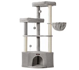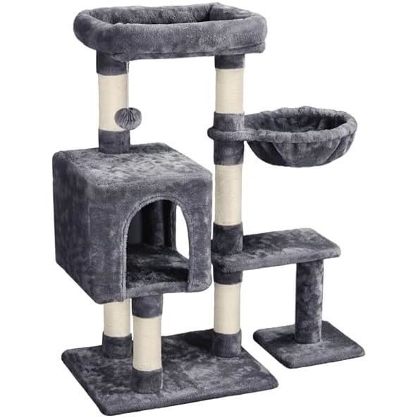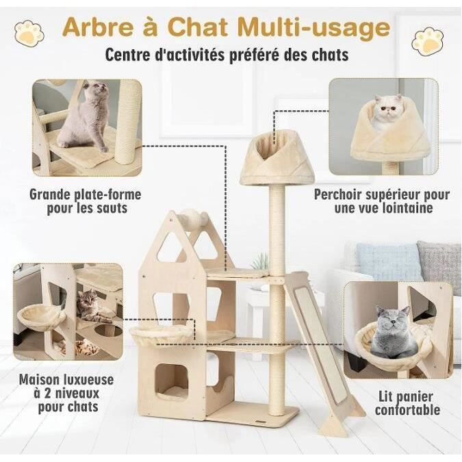 Pattes Actives, Chats Comblés Cet arbre à chat est doté d'une boule suspendue pour occuper votre compagnon pendant votre absence. Niche Spacieuse Cet arbre à chat, avec niche supérieur et cachette, offre à vos félins un espace moelleux et privé. Entretien sans Effort : Le coussin est amovible et lavable en machine. Conçu pour les Félins Actifs : Cet arbre à chat dispose d'une structure en panneaux de particules solide, revêtu de peluche douce et enroulé de polyrotin robuste. En Toute Sécurité Doté d' un kit anti-basculement, cet arbre à chat multiniveau est assez robuste pour que les chats s'amusent en sécurité. 2 niches cachettes, 3 perchoirs à boule, 1 panier et des griffoirs partout. Il permet de loger 2 ou 3 chats de taille normale. Confort agréable Arbre à Chat Tour pour Chat en Forme de Quenouille de 150 cm avec Griffoirs en Sisal Perchoir Cabane Hamac Doux Coussins Lavables Beige - Gamm vert Douceur et Confort Offerts : Ce petit arbre à chat, avec niche supérieur et cachette, offre à vos félins un espace moelleux et privé. Refuge Complet pour Chat : Niche en hauteur, cachette chaleureuse avec entrée, plateforme pour se détendre, griffoir en sisal et boule suspendue avec clochette : tout est là dans ce centre d'activités pour divertir et apaiser votre félin Griffes Saines, Meubles Préservés : Avec un poteau griffoir de 48 cm en sisal sélectionné, cet arbre à chat design satisfait l'instinct de griffade du chat. Poids d'expédition : 9,7 kg Cachette Chat Confortable Abician Arbre à Chat Désign Cactus En Peluche Centre D'Activité Chaton Griffoir Sisal Pour Chat Arbre à chat design : confort et jeu pour votre félin Spécifications : Matériaux : Panneaux de particules, Polyester, Sisal, Polyéthylène Couleur : Beige Dimensions assemblées : 49 cm L × 41 cm l × 91 cm H Base : 49 cm L × 41 cm l Niche supérieure : 40 cm L × 35 cm l × 8,5 cm H Cachette : 39 cm L × 31,5 cm l × 32 cm H ; Diamètre de l'entrée : 19,5 cm La structure de cet arbre à chat robuste propose un espace de jeu vertical stimulant, tout en s'intégrant harmonieusement à votre intérieur. Charge maximale cachette / niche supérieure : 10 kg Conçu en panneaux de particules solides, peluche douce et polyrotin résistant, cet arbre à chat avec griffoir associe solidité et élégance. De quoi stimuler son instinct de jeu et préserver vos meubles Il l'aide à entretenir ses griffes tout en détournant son attention de vos meubles