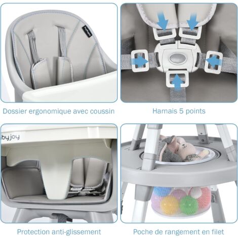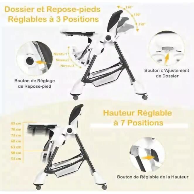 🥐【NETTOYAGE ET ASSEMBLAGE】En suivant le manuel clair, vous pouvez assembler la chaise haute facilement. Cette chaise haute est fabriquée en matériau de haute qualité, sûr, écologique et non toxique, avec un plateau réglable en deux positions facile à nettoyer et passe au lave-vaisselle Vous cherchez une chaise haute pour votre bébé ? La chaise haute a deux jeux de pieds en bois de hêtre massif, vous pouvez adapter la hauteur de la chaise haute à la croissance de l'enfant. Les parents n'ont pas à s'inquiéter de voir leurs enfants salir la chaise haute. Il suffit d'essuyer le siège en PU avec un chiffon humide. Les plateaux peuvent être lavés au lave-vaisselle. 5 RAISONS, CHOISIR NOTRE CHAISE HAUTE BEBE Le plateau dispose de 2 niveaux de réglage télescopique L'assise en PU est facile à nettoyer avec un chiffon humide Les coques en PP peuvent être démontées et lavées. COSTWAY Chaise Haute Pour Bébé Evolutif 6-en-1 Ensemble Table Et Chaise Hauteur Rglable Avec Plateau Et Panier De Rangement Gris 45407934 🥐【REPOSE-PIED AMOVIBLE】La chaise haute est équipée d'un repose-pieds réversible. La chaise haute accompagne le bébé de 6 mois -6 ans. La chaise haute dispose de deux plateaux amovibles, le plateau supérieur convient pour manger et le plateau inférieur pour jouer. La structure pyramidale rend la chaise difficile à vaciller et les repose-pieds antidérapants inférieurs offrent une stabilité accrue. Dans l’ensemble, cette chaise haute pour bébé 6 en 1 est un cadeau parfait pour les bébés âgés de 6 à 36 mois Chaise Bébé 6 Mois 6 Ans Plateau Amovible Bebelissimo - Chaise Haute Bébé Evolutive -dès 6 Mois Jusqu'à 20kg -disco Pinguin - Hauteur Réglable - Vert Bebelissimo J'aime | La Redoute Chaise Haute 6 En 1 Plateau Amovible La chaise haute avec pieds en bois de hêtre est robuste La chaise haute polyvalente répond aux différents besoins des enfants SPÉCIFICATION : Couleur : Beige / Gris Matériaux : Bois de hêtre, PP, PU Dimensions de la chaise haute : 50 x 57 x 85 cm (L x l x H) Dimensions de la chaise basse : 37 x 37 x 58 cm (L x l x H) Taille du plateau : 46 x 23,5 cm Poids net : 5,4 kg Capacité de charge : 25 kg Âge recommandé : 6 mois - 6 ans LIVRAISONS : 1 x Chaise haute bébé 1 x Manuel de l’utilisateur multilingue
