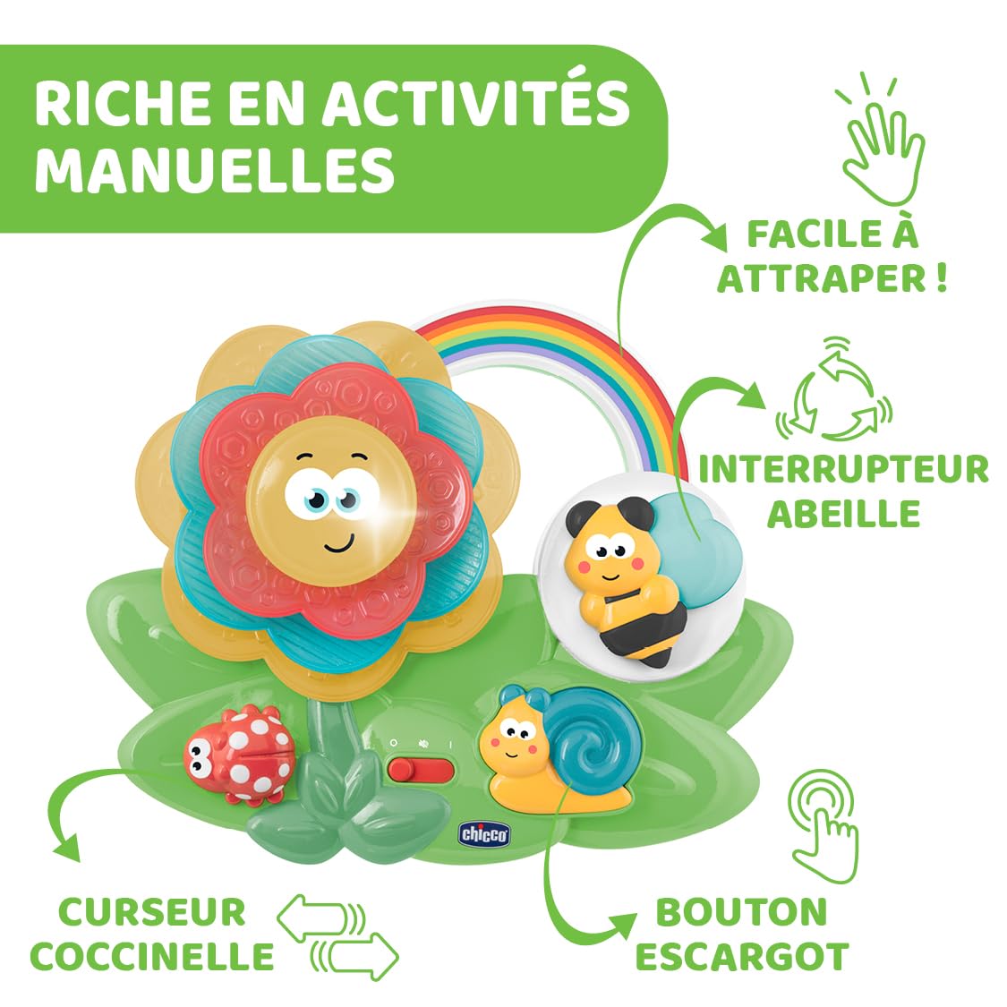 Avertissement De Sûreté Lisez attentivement les instructions et les avertissements contenus dans la notice et sur l'emballage avant utilisation Chicco Chemin d'Expériences Sensorielles; Tapis de Jeu Bébé Electronique et Trieur de Formes avec 5 Tapis Souples et une Fleur avec Sons et Lumières Jeu interactif Emotibee Chicco Emotibee est l'abeille électronique qui apprend à l'enfant à reconnaître les émotions primaires grâce à l'association avec des expressions faciales, des mélodies, des sons et des couleurs. Il décrit 4 émotions : la joie, la peur, la colère et la tristesse Chaque émotion est associée à l'expression du visage, à la couleur, aux sons et aux mélodies. L'abeille montre 4 émotions : joie, peur, colère et tristesse. Jeu éducatif et électronique Vtech Kidisecrets Ma Boîte à Bijoux Bleu... Le jouet développe des compétences de coordination manuelle. Description du produit L'abeille des émotions est l'abeille électronique qui enseigne le sens des émotions en les reliant aux expressions faciales, aux mélodies, aux sons et aux couleurs. Jouet 1 An Textures Sons Chicco , Abeille Électronique Interactive Et Parlante Qui Enseigne Les Émotions Avec Des Expressions Faciales, Des Phrases, Des Lumières Colorées Et Des Sons, Jeu Éducatif, Jouet 1-3 Ans Jeu Des Emotions