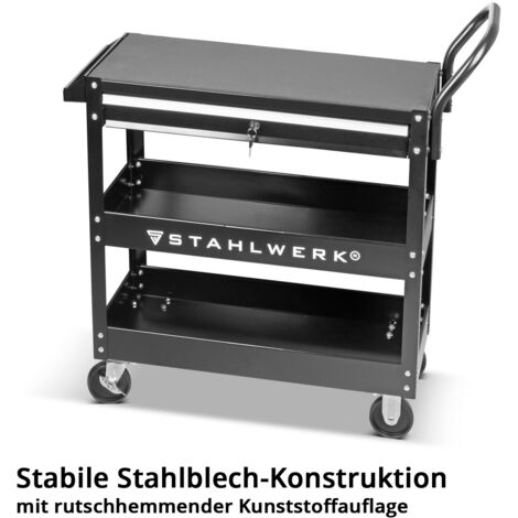 Les roulettes caoutchoutées Long-Life très résistantes (dont deux roulettes fixes et deux roulettes pivotantes) permettent de manœuvrer facilement la servante. STAHLWERK WZE-3 ST Servante à outils avec capacité de charge de 150 kg, tiroir verrouillable et 3 surfaces de chargement, chariot d'atelier en acier Description du produit STAHLWERK Chariot à outils WZE-3 ST avec capacité de charge de 150 kg, tiroir verrouillable et 3 plateaux Chariot d'atelier | chariot à plate-forme Avec une capacité de charge de 150 kg, cette servante à outils de qualité supérieure convainc par ses multiples possibilités d'utilisation pour le rangement des outils. Testez les produits, soudage, échantillonnage sur place - Laissez-vous convaincre par notre qualité supérieure Le chariot à étages polyvalent garantit beaucoup d'espace et un accès rapide aux outils et accessoires. Contenu de la livraison 1 x STAHLWERK chariot à outils WZE-3 ST Garantie de 7 ans conformément au § 6 Conditions de garantie, plus d'informations : cliquez sur le nom du vendeur et cliquez sur les conditions générales et l'aide. Servante atelier 6 tiroirs - Bac porte-outils - Fermeture sécurisée - 2... Équipée de trois plateaux de chargement spacieux et d'un compartiment de rangement pour les tournevis, la servante à plate-forme offre beaucoup de place pour les petits et les grands outils. Balconera Diable pliable avec 2 roues, réglable en hauteur, capacité de charge de 150 kg, 2 Stahlwerk Tool Car WZE-3 ST Avec Une Capacité De Charge De 150 Kg Un Tiroir Verrouillable Et 3 Zones De Charge Car Atelier Carte De Plate Forme Trot Voiture De Transport Monta Conduits Voiture De Plancher Charrette A Bras Les freins d'arrêt intégrés peuvent être actionnés confortablement avec le pied et assurent une bonne stabilité du chariot. La servante à plateaux polyvalente garantit beaucoup de place et un accès rapide aux outils et aux accessoires. La construction en acier sans torsion du chariot garantit une stabilité maximale, même sous les charges les plus élevées. Accessoires adaptés Grand choix d'équipements adaptés dans la qualité habituelle de STAHLWERK. Avec une capacité de charge de 150 kg, cette servante à outils de qualité supérieure convainc par ses multiples possibilités d'utilisation pour le rangement des outils.
