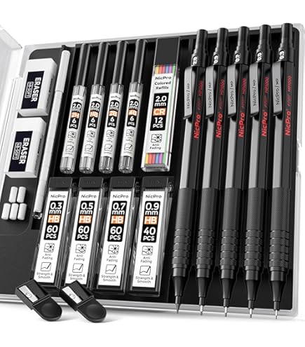 Fournitures de dessin exquises : Nicpro le coffret de 26 porte-mines comprend : 1 carnet de dessin (14 x 21 cm, 100 feuilles), 3 porte-mines à dessin (0,5, 0,7, 0,9 mm), 3 porte-mines de 2,0 mm, 6 tubes de mines HB de 0,5/0,7/0,9 mm (128 pièces), 4 tubes de mines graphite de 2,0 mm (4B, 2B, HB, 2H, 32 pièces), 1 tube de 12 mines de couleur, 2 gommes 4B, 1 gomme mie de pain, 9 gommes à capuchon, 2 taille-crayons et un étui portable avec élastique. Achetez Nicpro 26 pièces kit de fournitures de dessin artistique, ensemble de porte mine 0,5, 0,7, 0,9 et 2 mm, carnet de croquis 100 feuilles, recharges de mines 172 pièces, cadeaux de fournitures scolaires Un kit tout-en-un pour le dessin, l'esquisse, le coloriage et la tenue d'un journal. Que ce soit pour dessiner, gribouiller ou tenir un journal quotidien, ce bloc à dessin est un outil indispensable pour les artistes, les étudiants et les débutants. Un kit de dessin polyvalent pour tous les niveaux. Porte-mines 0.5 0.7 0.9 2mm Nicpro Kit De Fournitures De Dessin Artistique Avec 6 Crayons Crayon Papier Plusieurs épaisseurs de trait et 12 mines de couleur : Ce coffret porte mine propose des recharges de 0,5 mm, 0,7 mm, 0,9 mm et 2,0 mm pour des détails précis ou des traits plus épais. Poignée confortable pour porte mine: Nicpro tous les porte-mines sont dotés de poignées antidérapantes pour une prise en main confortable et un contrôle précis lors de longues séances d'écriture ou de dessin. Cadeau idéal pour les étudiants et les artistes : Ce coffret complet de fournitures artistiques est un cadeau attentionné pour les adolescents et les adultes qui aiment dessiner, esquisser, tenir un journal ou réaliser des dessins techniques. Mines lisses et résistantes à la casse pour l'écriture quotidienne ou les croquis professionnels. Nicpro 15 Stück Druckbleistifte Set,0,5 & 0,7 & 0,9 mm Minenbleistift, Mechanische Bleistifte Les pages perforées permettent de détacher facilement le papier pour le partager ou l'encadrer. Nicpro 5 étal Porte ines 2 - Cuir Étui, Art Crayon écanique...