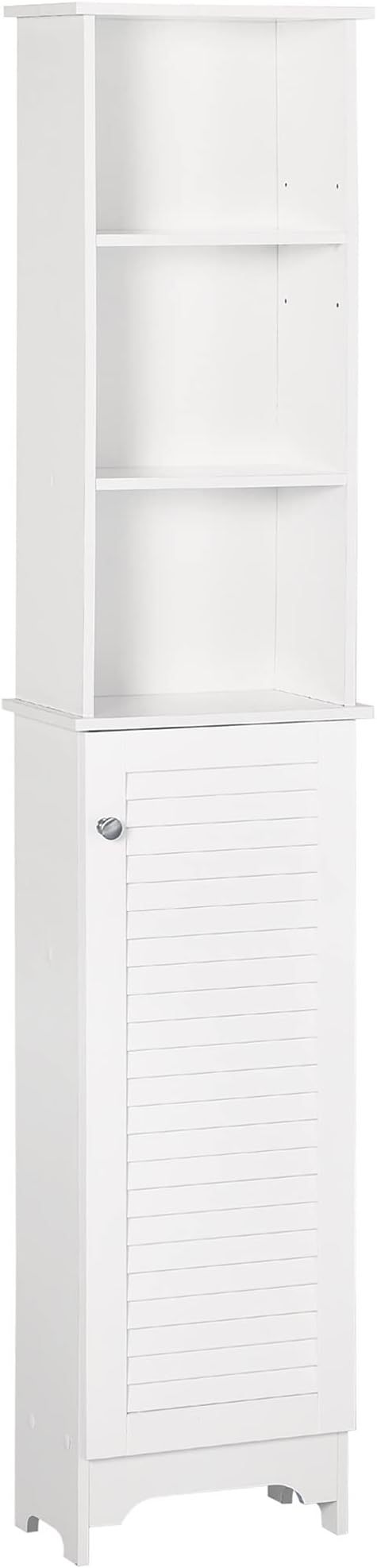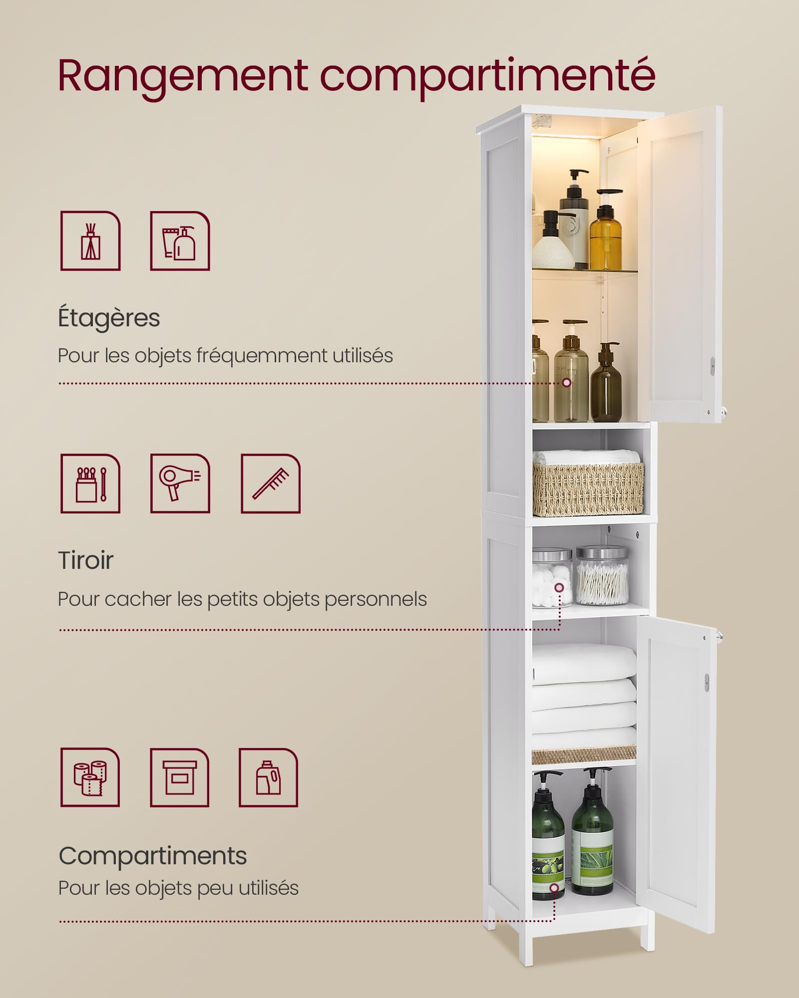 VASAGLE Meuble De Salle De Bain Avec éclairage, Meuble De Salle De Bain Avec Eclairage Meuble De Salle De Bain Haut Et Mince Meuble De Rangement Avec Etageres Reglables Compartiments Ouverts Pour Petits Espaces Moderne Blanc Nuage Protègent le meuble de l’humidité et permet de nettoyer le sol en dessous. Livraison : 1 x Meuble salle de bain, 1 x Kit de montage , 1 x Dispositif anti-basculement , 1 x Mode d’emploi Sécurité renforcée : Dispositif anti-basculement inclus pour une fixation murale fiable. Grande capacité : 2 placards fermés, 2 compartiments ouverts au centre et un grand tiroir offrent des espaces de rangement généreux. Durable et facile à entretenir : Fabriqué en panneau MDF laqué de qualité, il est durable et se nettoie facilement, pour une longue vie sans souci Les étagères réglables s’adaptent facilement à tous vos objets, quelle que soit leur taille Ne laissez pas d’eau stagner sur l’armoire pendant de longues périodes pour éviter les fissures et les déformations. Les objets rangés laissent deviner subtilement leurs contours, alliant discrétion, élégance et fonctionnalité. Meuble Colonne de Salle de Bain, Armoire Haute Meuble Rangement avec 2 Le kit anti-basculement permet de fixer le meuble haut au mur pour renforcer la stabilité et la sécurité. COSTWAY Colonne Salle de Bain, Armoire Haute à 4 Portes avec 2... Capacité de charge statique maximale du plateau en verre trempé supérieur : 15 kg La poignée arrondie est facile à retirer, elle est solide et durable et vous accompagnera donc pendant des années. Précautions de VASAGLE : Pour plus de sécurité, veuillez fixer le meuble au mur avec le dispositif anti-basculement fourni. Style épuré : Cette armoire de salle de bain s’intègre aisément à tous les espaces de vie. Espace de rangement généreux : 2 placards, 2 compartiments ouverts et un grand tiroir. Capacité de charge statique maximale du plateau central : 10 kg Nettoyage facile, utilisation sûre : ce meuble de salle de bain haut est fabriqué en MDF laqué de haute qualité et peut être maintenu propre sans effort. La livraison comprend également une protection contre l'inclinaison pour un montage mural sûr et stable Les point forts de ce meuble de salle de bain en bref : Éclairage pratique : Barre lumineuse à interrupteur pour une meilleure visibilité et facilite la recherche des objets. Capacité de charge statique maximale du plateau inférieur de meuble : 20 kg