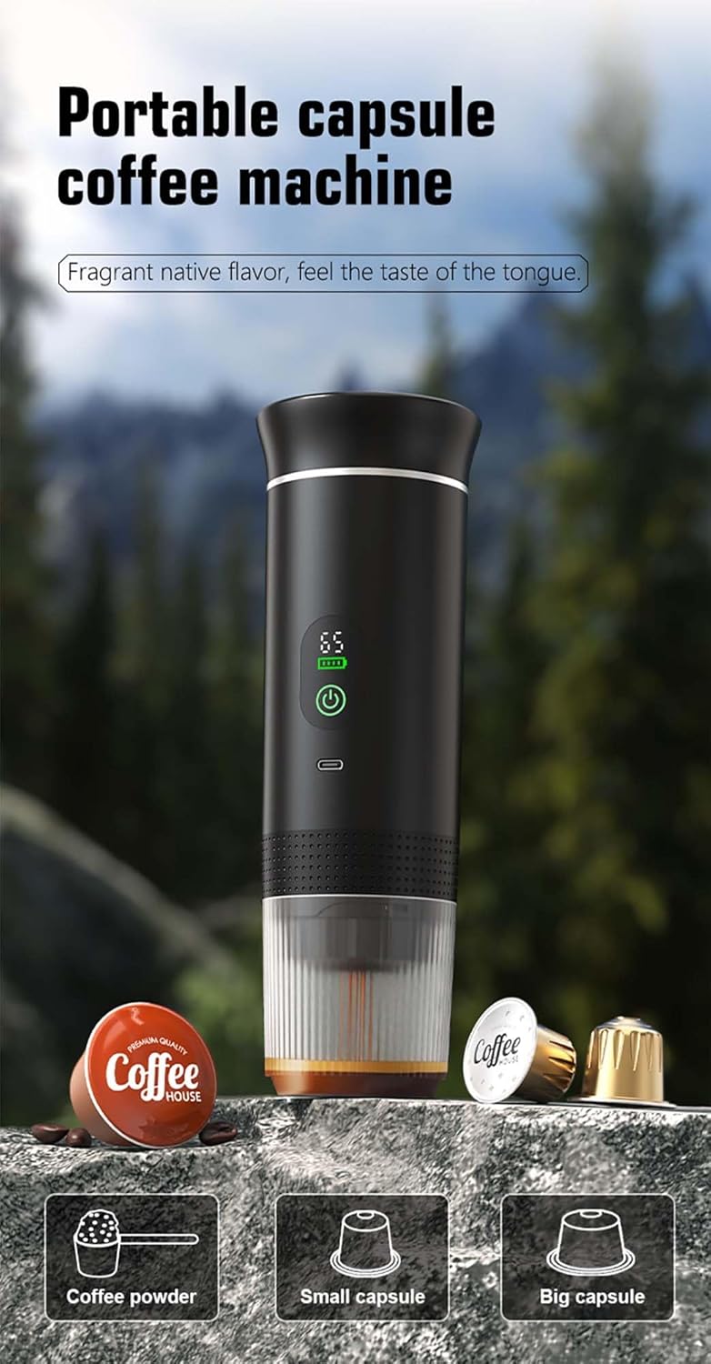 PZCC achine à Café Portable de Voyage,Expresso Cafetière Rechargeable 12V et sa pochette Pour Cafetiere Dolce Gusto Niaetuto Cafetière Portable 3 En 1,Rechargeable Cafetière Portable De Voyage,12V Machine A Cafe Pour Capsule,Café Moulu,pour Camping ,Voyage,Bureau,Voiture,Maison (Noir Machine A Cafe Portable Un Cadeau Idéal pour les Amateurs de Café : La mini cafetiere electrique n'est pas seulement facile à utiliser, c'est aussi un cadeau bien pensé pour les amateurs de café. Cafetière Portable Multifonctionnelle : Machine à expresso portable 3 en 1 avec support à café en poudre, couvercle à café en poudre et support à capsules, compatible avec les petites et grandes capsules et le café moulu pour tous vos besoins en café Une pression prolongée sur l'interrupteur permet de démarrer directement la fonction d'extraction. Petits prix et livraison gratuite dès 25 euros d'achat sur les produits Generic. Commandez Machine à café portable 3 en 1 – Machine de voyage rechargeable par USB pour la maison, le bureau, la voiture et le camping, compatible avec les capsules et le café moulu Facile à utiliser, elle convient à tous les types d'eau chaude et froide COMPATIBILITÉ MULTIPLE] - La machine à expresso portable 3 en 1 est équipée d'un compartiment pour le marc de café et d'un compartiment pour les capsules, compatible avec les petites et grandes capsules et le marc de café Conception Portable et Rechargeable : Pesant seulement 900 g, la cafetière de voyage est facile à transporter et est livrée avec un câble USB Type-C et un câble de recharge pour voiture, afin que vous puissiez déguster un excellent café à tout moment, n'importe où. Extraction Intelligente : La cafetière à capsules adopte une fonction de chauffage intelligente, l'extraction est facile et pratique, double-cliquez sur l'interrupteur pour démarrer la fonction d'extraction du chauffage.