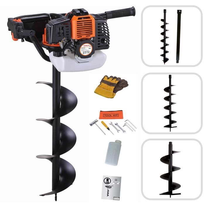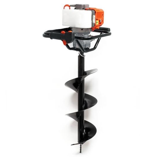 [Puissance optimale] – La tarière thermique de Wiltec est équipée d’un moteur à essence 2 temps de 1,4 kW et 52 cm³, offrant une puissance remarquable pour des travaux de forage rapides et précis. Mis à part la tarière, vous recevrez deux mèches de 250 mm et 300 mm. WilTec Kit Tarière Thermique à Essence - 530 x 370 x 320 mm - Moteur 2 Temps 1,4 KW 1,9 CV - Cylindrée 52 cm³ - Perceuse de Sol Jardinage Aménagement - Vis sans Fin Incluse de 100 mm Afin de réussir divers travaux tels que les plantations de végétaux, la pose de poteaux, ou les clôtures, ce kit pratique se composant d’une tarière puissante de 1,9 CV et d’une mèche robuste, vous permet de réaliser diverses tâches de jardinage en toute facilité Compatible avec des mèches tarière de 100 à 300 mm, elle répond à diverses applications, de la plantation à l’installation de clôtures Wiltec Kit Boîte à colis verrouillable gris anthracite et Pied, 470 x - Beaux-Arts et [Ergonomie et légèreté] – Grâce à un poids à vide de 9,5 kg et des poignées ergonomiques, cette tarière creuse garantit une manipulation facile et un confort optimal pour des travaux prolongés. [Robustesse exceptionnelle] – Fabriquée à partir de matériaux durables, la tarière à essence résiste aux environnements exigeants et aux usages intensifs. Outillage De Jardin Tarière Thermique Essence Set Avec Foret De 200 Mm - WILTEC - Outil De Jardinage - Puissance Tariere Electrique Dimensions tarière de terre : 530 x 370 x 320 mm tige : 58 mm x ø 20 mm diamètre tarière creuse : ø 100–300 mm tête de fleuret : Longueur : 760 mm ø 250 mm Épaisseur de lame : 2 mm Distance de la lame : 220 mm Pointe pointue : 75 mm, ø 15 mm Longueur : 800 mm ø 300 mm Épaisseur de lame : 2 mm Distance de la lame : 300 mm Pointe pointue : 75 mm, ø 15 mm Cette tarière à essence est le soutien idéal pour vos travaux dans le jardin et convient aussi bien pour une utilisation à la maison que dans le domaine professionnel de la sylviculture, de jardinage, de l’aménagement paysager et l’horticulture. Les poignées ergonomiques d’une part et le poids vide de 9,5 kg d’une autre, garantissent une manipulation confortable tout en facilitant le travail.