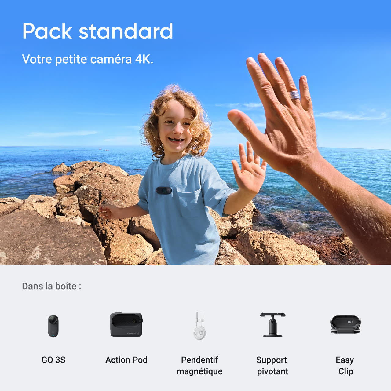 TOURNAGE SIMPLIFIÉ - Des enregistrements plus rapides et efficaces grâce au QuickCapture. 1 Stabilisation FlowState 2 Robuste et étanche 3 Contrôle et aperçu 4 Écran rabattable de 2,2 5 Batterie grande autonomie STABILISATION FLOWSTATE - La stabilisation FlowState et le verrouillage de l'horizon garantissent que vos vidéos sont toujours fluides et droites, quelle que soit l'intensité de l'action à laquelle vous confrontez la GO. Partagez facilement sur n'importe quelle plateforme, dans n'importe quel format, lorsque vous filmez en mode vidéo FreeFrame. Capturez des POVs mains libres en 4K avec le nouveau champ de vision FOV MegaView pour des plans ultra-larges avec moins de distorsion. Test : caméra Insta360 GO 3S, vlog 4K et autonomie 140 min COMPATIBLE APPLE FIND MY - Retrouvez rapidement votre GO 3S grâce au réseau Apple Find My, idéal si vous l'oubliez quelque part par accident. ÉDITION IA - Laissez l'édition automatique opérer sa magie en trouvant les moments forts et en les éditant en rythme avec la musique. Capturez des POVs mains libres et des angles uniques avec la petite caméra 4K étanche. Écran rabattable pour un contrôle et un aperçu depuis l'Action Pod Caméra 4K étanche 10m Stabilisation Autonomie 140min Insta360 GO 3S (64GB) - Petite Caéra De Vlog 4K, POV Ains Libres Stabilisation FlowState ROBUSTE ET ÉTANCHE - Capturez les moments passés sous l'eau sans effort avec la GO 3S étanche IPX8 ou l'Action Pod résistant IPX4., Plongez jusqu'à une profondeur de 60 mètres avec le caisson de plongée. 1 Compatible Apple Find My 2 Easy Switch 3 Vidéo à intervalles 4 Soyez créatif L' Insta360 GO 3S est parfaite pour le vlogging, les sports extrêmes et les voyages. Sa compacité, son autonomie améliorée et sa qualité vidéo en font une référence en 2025 39 G ET DE LA TAILLE D'UN POUCE - Débloquez une créativité sans limite avec l'Insta360 GO 3S, une petite caméra 4K puissante ne pesant que 39 g. Les nouvelles options de contrôle gestuel et de contrôle vocal offrent une facilité de tournage lorsque la GO 3S est hors de portée. 1 Petite et légère 2 Vidéo 4K 3 POVs mains libres 4 Montez-la n'importe où 5 Facile à filmer Le Pack POV cyclisme comprend : 1x GO 3S (128 Go), 1x Protège-objectif (préinstallé sur l'objectif par défaut), 1x Action Pod, 1x Pendentif magnétique, 1x Support pivotant, 1x Easy Clip, 1× Clip pivotant, 1× Cordon de sécurité pour pendentif magnétique, et 1× Coupe-vent pour micro.