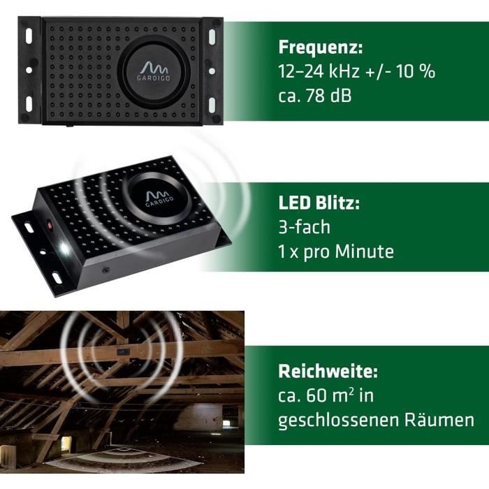 Idéal dans le carport, la cave, le hangar, le garage. Zone d'application : environ 40 m² , Fréquence : 35 000 Hz (±10 %) Les rongeurs sont rapidement incommodés par l'appareil et cherchent un endroit plus calme. Tevigo GmbH vous offre une équipe compétente pour un support rapide et efficace. C'est précisément ces sons ultrahauts que le répulsif anti souris de Gardigo émet pour perturber ces animaux. GARDIGO® Lot de 3 Répulsifs Anti-Souris, Rats et Rongeurs à Idéal pour le camping, la grange et l'écurie. 👍 UTILISATION FACILE: Le répulsif anti-rats nécessite 4 piles AA 1,5V (non incluses) et s'active par un interrupteur simple MARCHE/ARRÊT. Recommandé pour une utilisation continue pour prévenir les réinfestations. Vous avez remarqué ces signaux? Lot de meubles et objets endommagés par les rongeurs... Ultrason Souris Et Rats LEMENG Répulsif Pour Parasites Fiche à Ultrasons, Répulsif Pour Rongeurs Appareil électronique Pour Intérieur Contrôle Des Rats Avec Lumières, Répulsif Pour écureuils à Ultrasons Produit Anti Araignée Peut être utilisé partout grâce au fonctionnement sur Piles Le dispositif mobile fonctionne avec 4 piles Mignon (AA) (non incluses), vous permettant de l'utiliser de manière flexible partout où vous avez des problèmes de souris, sans avoir besoin d'une prise électrique. Intervalle : 15 secondes MARCHE / 45 secondes ARRÊT (indiqué par le clignotement de la LED) Le répulsif anti souris à ultrasons de est un répulsif à brancher sur une prise électrique. Ultrasons Inaudibles pour les humains Achetez-le dès maintenant Répulsif Anti-Souris Mobile de Gardigo Perturbe les rongeurs affamés Les rongeurs tels que les souris et les rats ont une excellente ouïe, car ils communiquent entre eux avec des ultrasons que les humains ne peuvent pas entendre. Sa portée peut atteindre jusqu'à 40 m². Caractéristiques techniques Dimensions : 8,2 x 8,2 x 3,7 cm Garantie sécurisée !