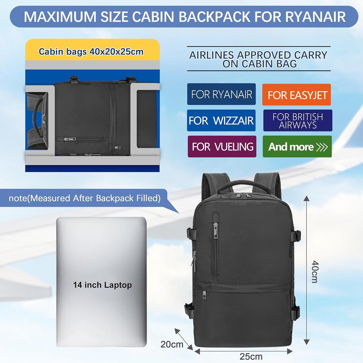 Sac Cabine Transavia 40x30x20 Lovevook Bagages Cabine 40x30x20, Pour Ryanair Sac A Dos Voyage Cabine Avion Sac à Dos Bagage A Main Petite Valise Cabine Easyjet, Ordinateur Portabl Dès 45,99 € - Sur Sac Femme 【Confort du dos et réduction du stress】- Notre bagage cabine présente un design de dos aéré confortable avec un rembourrage épais et doux, offrant un confort maximal pendant vos déplacements. Ce sac à dos court-courrier convient non seulement à un usage quotidien, mais aussi comme bagage personnel sur la plupart des compagnies aériennes européennes, telles que les autres compagnies aériennes YOKGO Sac a Dos Voyage Cabine Avion 40x30x20 Bagage Cabine,24L-30L Évolutif Sac à Dos Avion Pour Transavia, Ryanair, Vueling, Wizz Air,Bagage à Main 15.6'' Ordinateur Portable Homme Femme Blanc 【Fonctionnalités pratiques】- Notre bagage cabine est pensé pour la praticité. Les bretelles larges, respirantes et réglables avec rembourrage en mousse soulagent le stress des épaules. Sac Voyage Valise Cabine Pour Ryanair 40X20X25 Sac A Dos Bagage Cabine Avec Taille Valise Ryanair 40x20x25 【Durabilité et longévité】- Fabriqué en polyester de haute densité, léger et robuste, notre bagage cabine est conçu pour durer longtemps. Avec ses dimensions parfaites de 40x30x20 cm, ce bagage cabine s'adapte parfaitement sous le siège de l'avion. 【Superbe sac de cabine idéal pour Ryanair】- Notre bagage cabine est conçu pour respecter les réglementations de Ryanair en matière de bagages à main, avec une taille de 40x30x20 cm et une capacité de 24 L. De plus, il y a 2 poches en filet pour votre bouteille d'eau et votre parapluie. 【Rangement ample et organisation】- Il dispose d'un compartiment principal spacieux avec sangle de compression pour les vêtements et les articles personnels, d'un compartiment séparé pour ordinateur portable avec des poches multifonctions pour les ordinateurs portables , et d'une poche avant d'accès rapide pour votre téléphone ou votre passeport. De plus, une poche arrière anti-vol assure la sécurité de vos affaires. Il dispose d'une poche humide dédiée à l'intérieur du compartiment principal, permettant de séparer les articles mouillés. Que ce soit pour le travail ou les voyages, ce sac à dos compact maximise l'espace disponible tout en respectant les restrictions de bagage à main des compagnies aériennes low-cost.