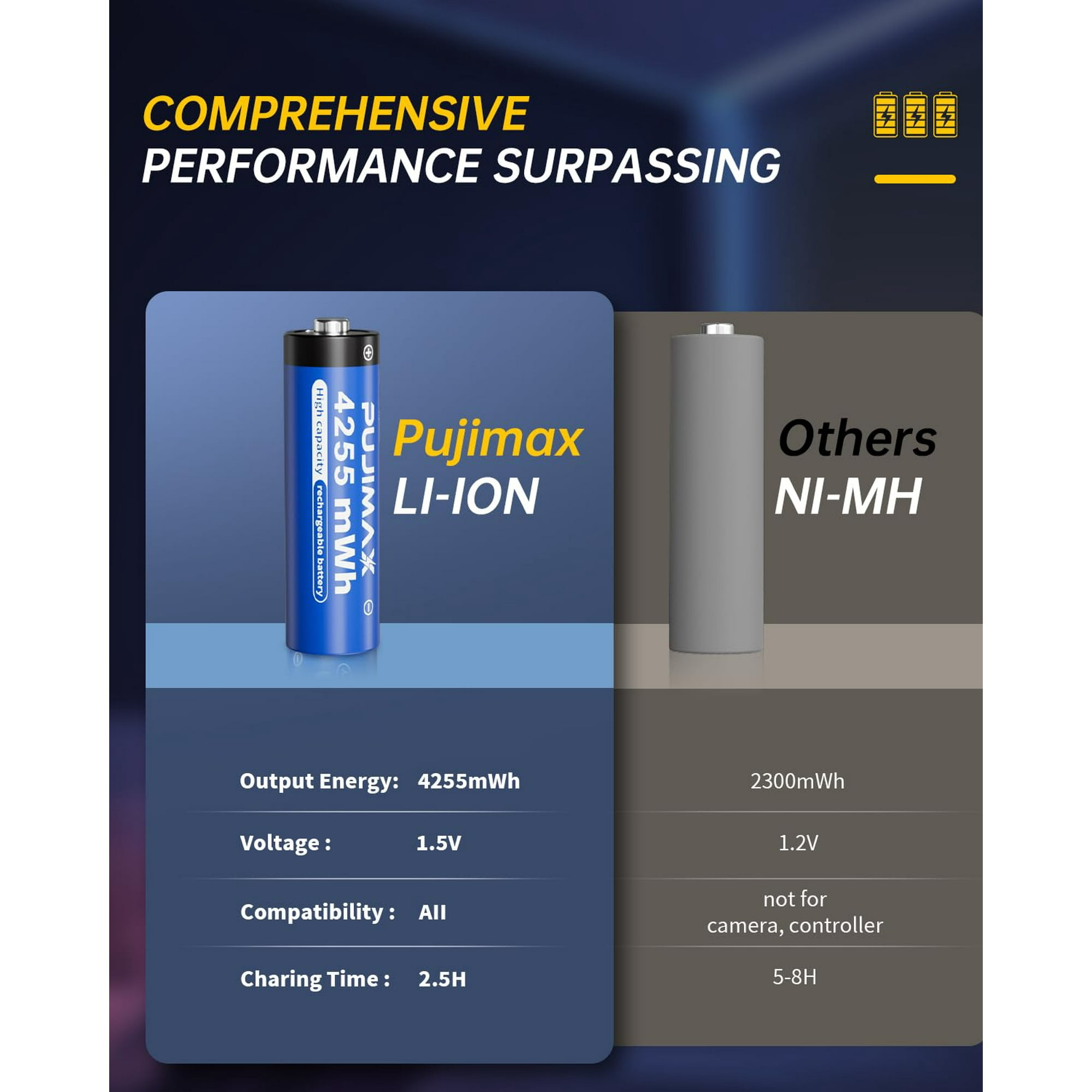 Longue durée de vie avec plus de 2000 cycles de recharge : les piles rechargeables au lithium AA PUJIMAX sont conçues pour durer plus longtemps. Dites adieu aux remplacements fréquents de batterie et profitez d'une puissance étendue pour vos appareils. Compatibilité sans tracas : les piles au lithium rechargeables PUJIMAX de taille AA sont compatibles avec une large gamme d'appareils ménagers et de bureau, y compris la télécommande, la caméra de sécurité, le verrouillage intelligent, le clavier et la souris Chargeur Rapide USB C 20W PD Adaptateur Secteur Universel pour iPhone... Avec jusqu'à 2000 cycles de recharge, ces batteries offrent une valeur et une durabilité exceptionnelles. PUJIMAX cargador de batería de litio inteligente de 8 ranuras, 1,5 V, con AA1.5V, 3400mWh Respectueux de l'environnement et économique : choisissez une solution plus écologique et plus économique avec les piles au lithium AA rechargeables PUJIMAX En optant pour ces batteries haute performance, vous contribuez à réduire le gaspillage causé par les batteries à usage unique et économisez de l'argent sur le remplacement à long terme. La batterie AA rechargeable au lithium PUJIMAX avec chargeur rapide est notre produit PUJIMAX star et garantie après-vente d'un an. Lot 8 Piles AA Haute Capacité Iuto Lot De 8 Piles AAA Rechargeables Au Lithiu Avec Chargeur Rapide Piles 1.5V Constante Longue Durée Passez moins de temps à attendre et plus de temps à profiter de vos appareils. PUJIMAX Piles AA rechargeables avec chargeur Haute capacité pour une utilisation prolongée : avec une capacité impressionnante de 4255 mWh, les piles rechargeables au lithium AA PUJIMAX offrent des performances supérieures pour tous vos appareils électroniques, jouets, lampes de poche, caméra de sonnette clignotante et autres appareils à forte consommation.