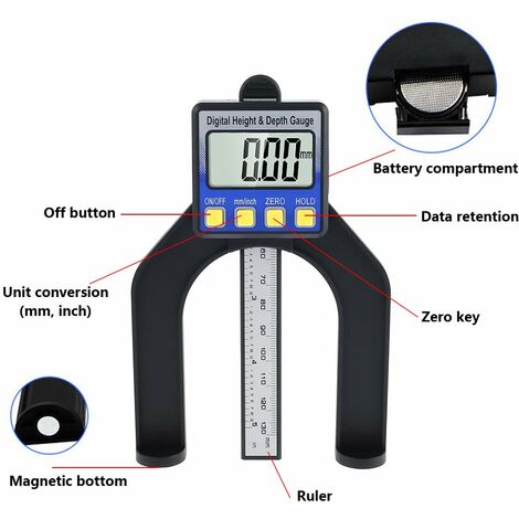 La jauge de profondeur Horex 2263722 est un outil de mesure précis, conçu pour des applications variées dans le domaine du bricolage et de l'ingénierie Facile et efficace à utiliser, livré avec 2 piles bouton LR44 de rechange pour le remplacement Jauge Profondeur Numérique 0-300 Mm Précision 0.01mm Jauge De Hauteur Et De Profondeur Numérique EJ.LIFE Avec Base Mesure Profondeur Précision 0.01mm Matériau : acier inoxydable. Vous pouvez également régler le point zéro et basculer rapidement entre pouces et millimètres si nécessaire. Large application : parfait pour régler la hauteur des lames de scie, ce qui en fait un outil indispensable lorsque vous êtes engagé dans des projets de travail du bois délicats Affichage numérique bien lisible. Propriétés de glissement optimales grâce au guidage prismatique double. Semelles en aluminium pourvu d’un revêtement dur, avec deux alésages décalés de 90° (M2,5) pour touches de mesure METRICA 12145 - 12145-SKU JAUGE DE PROFONDEUR NUMÉRIQUE | Mister Worker Haute précision : précision de résolution de ± 0,01 mm, intuitive et fiable. Écran facile à lire : la jauge de profondeur dispose d'un écran LCD numérique qui vous permet de lire facilement et clairement les résultats de mesure. Type de batterie : 1 pile bouton LR44 (incluse).