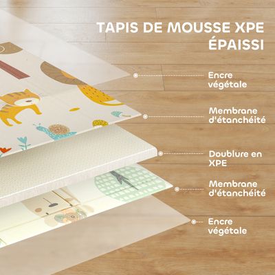 DESIGNS ANIMAUX MIGNONS : Illuminez la chambre de votre bébé avec ce tapis de jeu réversible orné de motifs animaux attendrissants. Le tapis de jeu AIYAPLAY crée un espace sécurisé pour les bébés, avec des motifs d'animaux colorés des deux côtés qui stimulent l'imagination. Texture antidérapante aide à soutenir les premiers pas avec confiance totales : 195L x 146,5l x 1,5H cm. Surface résistante à l'eau se nettoie rapidement après des déversements Tapis de jeu pour Bébé,Tapis d'Éveil et de jeux Pliable en Mousse Imperméable Non Toxique pour Enfant Impression Renard Ours Animaux Mignons 150x200x1cm (Animal) - D3 Toys ! Le Monde Magique Des SPACIEUX ET PLIABLE : Avec une superficie de 2,86 m², ce tapis de jeu pour bébé offre un vaste espace pour que les bébés puissent explorer en rampant ou en faisant leurs premiers pas. Facilement pliable et léger, il est fourni avec un sac de rangement qui simplifie son transport et son stockage., SPÉCIFICATIONS : Dim. Le tapis de jeu pour enfant AIYAPLAY, avec son design animalier double face, stimule la curiosité des enfants. Fabriqué en matériau XPE robuste et doté d'un... Tapis éveil Sensoriel Animaux AIYAPLAY Tapis De Jeu Pour Bébé Pliable Et Réversible, Tapis Espace Sécurisé Bébé Ramper Jouer Tapis de jeu pliable et portable facilite le rangement et le voyage. Idéal dès le ventre jusqu'au jeu, il garantit confort et sécurité à chaque étape. Le tapis de jeu pour bébé AIYAPLAY crée un espace sécurisé et clôturé grâce à ses côtés pliables. Son matériau XPE épais et rembourré et ses bords cousus offrent une surface confortable pour ramper, tandis que son design double-face stimule l'imagination et s'intègre parfaitement à votre décoration intérieure Design révisable avec des motifs d'animaux vifs qui encouragent la créativité et l'exploration Avec sa surface antidérapante, il garantit la sécurité des tout-petits lors de leurs premiers mouvements. Package includes: 1 x Tapis de Jeu Pour Bébé 1 x Sac de Rangement 1 x Manuel Surface de couverture : 2,86 m²., Âge approuvé : 0+.