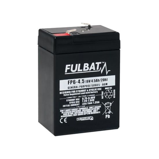 Gaz recombinés à plus de 99% (VRLA) Batterie 6V 2.8Ah Batterie Moto Fulbat 6N4-2A/A-4 GEL Accumulateur Plomb-calcium Longue Durée Fonctionne dans n'importe quel sens (sauf utilisation inversée continue) Caractéristiques : Sans entretien et étanche Faible autodécharge (3%/mois à 20 °C) Fulbat Akumuliatorius 6 Ah 85 A EN 12V Grilles en plomb-calcium pour une meilleure durée de vie Baterie, Fulbat, 53030 / Y60-N30L-A, DRY + pachet acid, Multicolor Branchement en série/parallèle possible Hautes performances grâce à la technologie AGM