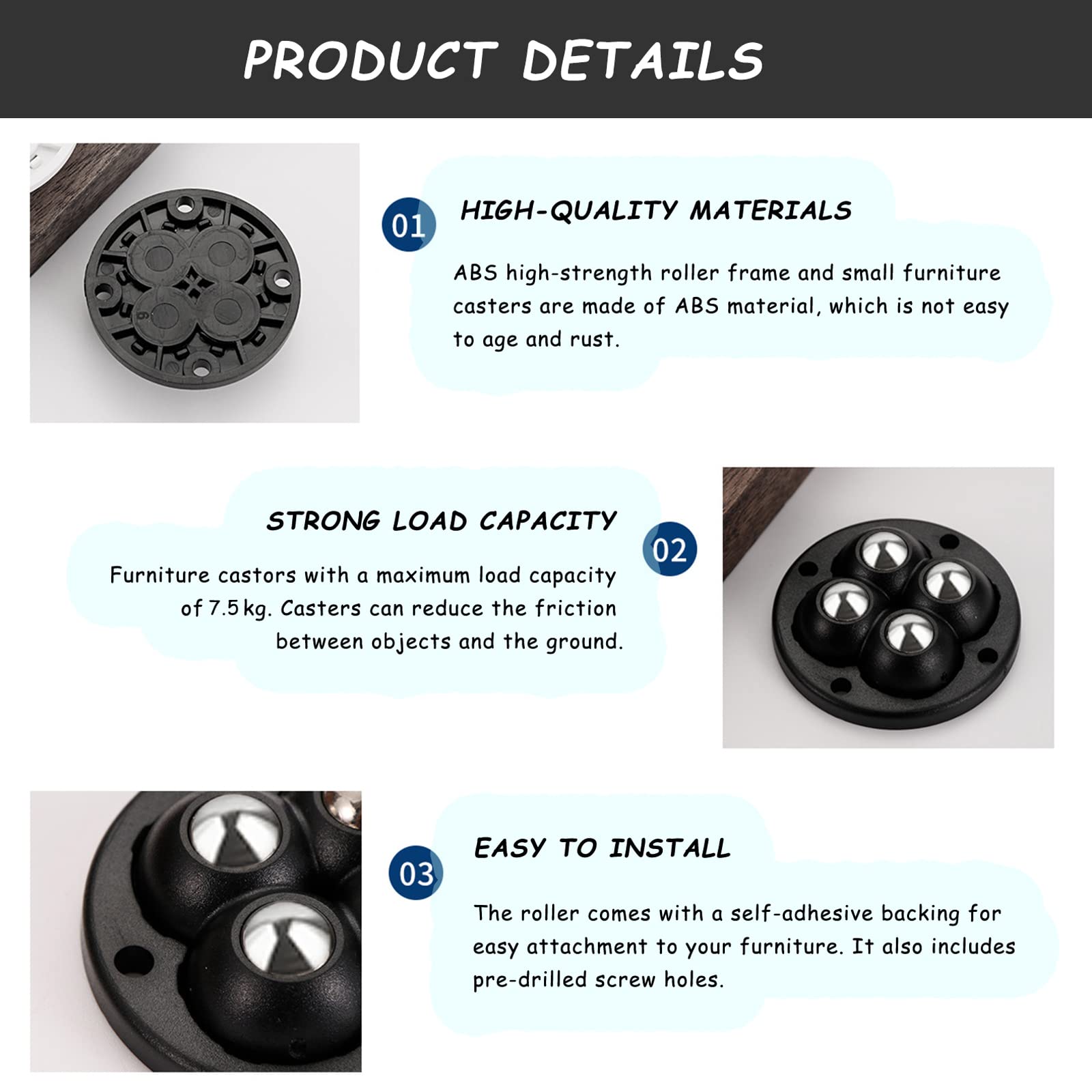 ⚫️【Petit et léger】 - Ces rouleaux autocollants mesurent 1,8 x 1,8 pouces, petits et légers, faciles à appliquer, avec une forte capacité de charge, parfaits pour un usage domestique. ⚫️【Roues lisses】 -Chaque petit rouleau est équipé de 3 poulies en acier inoxydable, extrêmement lisses et pouvant pivoter à 360 degrés, ce qui facilite le déplacement des objets dans n'importe quelle position. ⚫️【Application multifonctionnelle】 - Les roues adhésives universelles sont parfaites pour coller au fond des boîtes de rangement, des poubelles et des pots de fleurs pour les aider à se déplacer rapidement. Lot de 8 mini roulettes pivotantes autocollantes à 360 degrés - Poulie C'est un accessoire indispensable pour la maison et adapté également aux besoins de bricolage. Roulettes pour petits appareils électroménagers, roulettes autocollantes noires. Fixation sûre : Le support adhésif solide garantit que les roulettes restent bien en place, même sous de lourdes charges 20 Pcs Roulettes Pivotantes Autocollantes Roulettes De Meubles Poulie De Boite De Rangement Roulettes A Billes De Transfert Mini Roulette Meuble En Plastique Pour Meubles Diverses Boites De Rangement 84518982 Durabilité longue durée : roulettes pivotantes autocollantes. Fabriquées à partir de matériaux de haute qualité, nos mini roulettes universelles sont conçues pour supporter des charges lourdes allant jusqu'à 80 livres, garantissant ainsi leur résistance à l'épreuve du temps. petites roulettes pivotantes