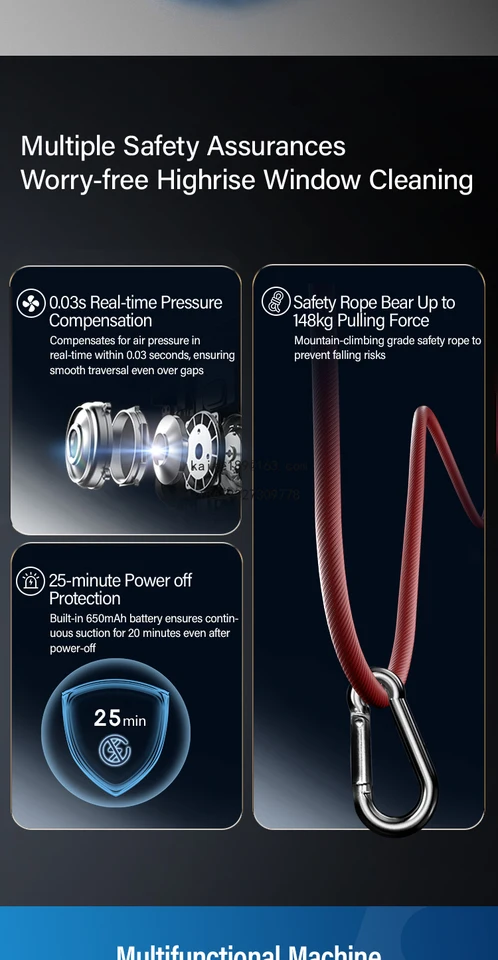 Conçu pour des performances de nettoyage supérieures Structure à tampons flottants 3D Le système breveté de tampons flottants 3D utilise deux tampons montés sur ressorts qui s’adaptent automatiquement aux surfaces irrégulières. Caractéristiques techniques Robot Nettoyeur Vitre S7: • Dimensions : 29,5 × 14,5 × 8,9 cm • Poids net : 1 kg • Puissance nominale : 90 W • Tension : 24 V • Niveau sonore : 73 dB • Puissance d’aspiration : 2000–5500 Pa • Surface minimale nettoyable : 30 × 30 cm 📦【 Contenu】1 S7 Plus, 1 alimentation portable, 1 boîte de rangement, 1 chargeur, 5 buses, 1 corde de sécurité, 5 lingettes, 1 télécommande, 1 flacon, 1 manuel. Sa batterie de secours intégrée maintient l'aspiration pendant 25 minutes en cas de coupure de courant. Il fonctionne parfaitement sur les fenêtres sans cadre, miroirs, fenêtres de toit inclinées, murs en marbre et portes en bois. Cela garantit un contact total avec la surface, une pression constante et un nettoyage sans traces. Conçue pour les robots lave-vitres Optimisée spécifiquement pour les robots lave-vitres HUTT, la batterie E+ assure une alimentation efficace et sécurisée. Nettoyeur lave vitre sans fil gris blanc - Electroménager Associé à des tampons en microfibre haute densité, il retient l’eau et capture la saleté dissoute pour un nettoyage en profondeur, sans résidus. Précision mécanique pour un nettoyage stable et puissant Le châssis triangulaire incliné vers l’intérieur (2 à 3°) augmente la pression aux extrémités extérieures des tampons, empêchant tout soulèvement près des joints et des angles. Nettoyeur de vitre sans fil Mac Allister 3.7V - 2.2Ah l. 280 mm | Castorama Système de sécurité multicouche avancé Une batterie de secours intégrée de 650 mAh maintient le robot fixé pendant jusqu’à 25 minutes en cas de coupure de courant soudaine. Associé à un canal d’air optimisé, il maintient une adhérence stable même sur les surfaces entièrement mouillées, sans glisser. La navigation automatique est optimisée pour des angles compris entre 35° et 145° ; en dehors de cette plage, un contrôle manuel est recommandé pour des résultats optimaux. 🎮【Contrôle Facile par Télécommande】Un seul bouton pour démarrer ! Avec un débit de 2000 mg/min et un réservoir visible de 80 ml, il permet de nettoyer jusqu’à 60 ㎡ par remplissage et élimine jusqu’à 15 types de taches avec un nettoyant vitres. Il suffit de brancher la batterie E+ pour nettoyer librement, là où aucune alimentation fixe n’est disponible. 🔋【Double Mode d'alimentation】Le HUTT S7 Plus propose deux modes : batterie (autonomie de 60 minutes sans prise) et secteur (nettoyage continu des grandes surfaces vitrées). Le câble combiné d’alimentation et de sécurité, ainsi qu’une corde de sécurité secondaire haute résistance, garantissent un fonctionnement sans enchevêtrement et une double protection antichute. Oubliez l’échelle -- nettoyez les vitres hautes ou difficiles d’accès en toute sécurité depuis le sol, sans grimper ni vous étirer. La puce HUTTHINK surveille la pression d’air en temps réel et compense les baisses en seulement 0,04 seconde, assurant une aspiration stable et un suivi précis des bords. Contenu de l’emballage: • Robot lave-vitre ×1 • Boîte de rangement ×1 • Télécommande ×1 • Chiffons de nettoyage ×8 • Adaptateur secteur ×1 • Corde de sécurité ×1 • Câble d’alimentation ×1 • Buses de rechange ×4 • Bouteille vide ×1 • Alimentation portable E+ ×1 Pilotez le robot vitre nettoyage à distance et atteignez les zones les plus inaccessibles en toute simplicité. Des performances fiables, conçues pour un usage durable. Laveur De Vitre Automatique Test Du Robot Nettoyeur De Vitre HUTT S7 Plus : Efficacité Sans Fil Et Protection Maximale Double Moteur Tampons 3D Aspiration 5500Pa Deux tampons motorisés indépendamment tournent à 70 tours/minute, simulant un mouvement de nettoyage en spirale, avec une puissance d’aspiration de 5500 Pa et une pression de 55 N. Astuce : Ajoutez quelques gouttes de nettoyant vitres ou d'alcool sur la lingette. Lave-vitre électrique,Nettoyeur de vitres électrique sans fil,essuie... S’adapte à toutes les surfaces et à tous les angles Le robot ajuste intelligemment sa puissance d’aspiration de 2000 à 5500 Pa selon la texture de la surface – plus faible sur le verre lisse, plus forte sur le marbre poreux ou le bois. Le design combiné du câble d'alimentation et de la corde de sécurité évite les enchevêtrements, le facteur de sécurité. Un système de sécurité 5-en-1 intégré protège contre la surcharge, la surtension, la surchauffe, la décharge excessive et les pics de courant. ⚡【Protections Multiples】Corde de sécurité alpiniste + compensation de pression en 0., 04s.