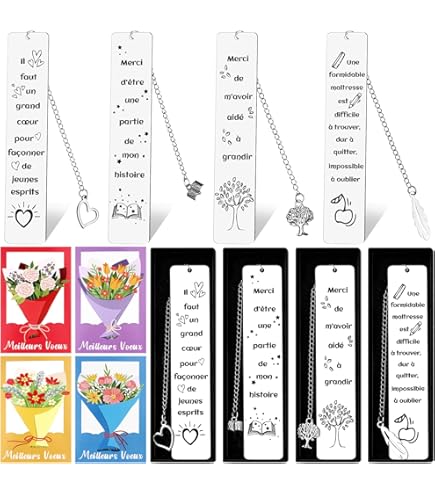 Cadeau Enseignant Cadeau Professeur, 3 Marque-Pages Métal Avec Cartes De Vœux,e En Francais, Cadeaux De Noël Pour Enseignants, Cadeaux De Remerciement Pour Educatrice Enseignants En Français Marque-pages Acier Inoxydable Sur le chemin du travail ou en voyage, vous pouvez le sortir de votre sac à tout moment, tant que vous avez envie de lire, sans vous soucier du contexte Cikonielf marque-page fleur 2 pièces marque-pages en métal or Rose... La petite feuille qui dépasse, absolument adorable. Et n'hésite pas à t'abonner pour euh plus d'idées cadeaux, à faire soi-même. Bisous! OCR Un Cadeau Idéal pour Inspirer : En tant que « cadeau inspirant », marques pages n'est pas seulement un outil de lecture, mais aussi un vecteur d'émotions et de bénédictions. Adaptation Polyvalente : Les possibilités d'utilisation du marque page dépassent l'imagination. Ensemble de Marque-pages en Acier Inoxydable - Cadeau Vous n'aurez plus à le glisser dans un livre, une trousse, un portefeuille ou même une poche, et il ne prendra pas de place comme du papier à lettres. Il peut également servir de pendentif décoratif pour sacs à dos et clés, pour vous accompagner partout avec votre personnalité et votre sens du livre., Utilisation :1., Cadeau pour la fête des enseignants : gravez des mots de remerciement à l'enseignant sur le marque page maitresse d'école, tels que « La grâce de l'enseignant est inoubliable » et « Les élèves sont partout dans le monde », puis offrez-le à votre enseignant bien-aimé dans un emballage raffiné., 2., Compagnon de lecture personnel : Que vous lisiez des livres papier, des magazines ou que vous étudiiez à la bibliothèque ou au café, ce marque page plume deviendra un élément lumineux de votre lecture et ajoutera une touche de rituel à votre lecture. Nous vous fournirons un service après-vente satisfaisant et vous offrirons une expérience d'achat agréable. Qu'il soit utilisé fréquemment pour la lecture quotidienne ou offert en cadeau, l'acier inoxydable préserve l'éclat et la forme des marque-pages Matériau de Haute Qualité : Ce marque-page en acier inoxydable est fabriqué en acier inoxydable de haute qualité. Léger et Portable : Ce stainless steel bookmark est léger et compact. Lorsque vos proches l'ouvrent et le voient, ils sont remplis de touches exclusives. Spécifications du produit :Matériau : Acier inoxydable Dimensions : Longueur 13 cm, Largeur 2,5 cm Poids du produit : 25 g Contenu : 3 livres marque-page en acier inoxydable Service clientSi le produit que vous avez reçu est inutilisable, endommagé ou ne vous convient pas, veuillez nous contacter.