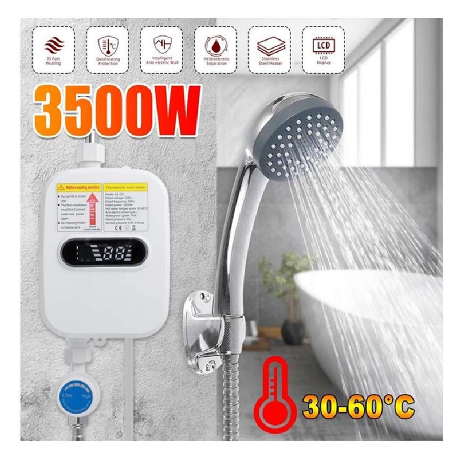 Cela nous permet donc de prendre un bain relaxant. Ce mini chauffe-eau électrique instantané transforme n’importe quel point d’eau en douche chaude confortable, sans installation complexe ni réservoir. Compact, rapide et sécurisé, il est idéal pour la salle de bain, une annexe, un atelier, une cuisine ou une résidence secondaire Il ne nécessite pas de stockage d'eau ni de préchauffageLe chauffe-douche électrique utilise un débit d’eau à température constante. Ne vous souciez plus de la température de l'eau. La structure hautement imperméable permet au fuselage de ne pas avoir peur des éclaboussures d'eau, afin que nous puissions nous baigner et nous rincer librement et profiter du plaisir apporté par le bain. Cette conception élimine en grande partie les fuites d'eau et d'électricité, ce qui améliore considérablement la sécurité de noss appareils électriques. Puissant étanche IPX4 : le chauffe-eau sans réservoir n'a pas peur des gouttelettes d'eau. Chauffage rapide] Le chauffe-eau électrique pour douche n'a pas besoin de stocker de l'eau pour la préchauffer : combien d'eau vous utilisez, combien d'électricité vous dépensez, vous n'avez pas besoin de chauffer et de garder au chaud à plusieurs reprises, et vous ne la gaspillez pas à domicile La séparation de l'eau et de l'électricité rend l'eau et l'électricité non connectées. CHAUFFE-EAU Mini chauffe-eau instantané chauffe-eau électrique avec Chauffe Eau électrique Instantané Castorama Chauffe-eau électrique Instantané, 6500 W, Sans Réservoir, Pour Salle De Bain, Douche, Salle De Chauffe-eau électriques Type de séparation de l'eau et de l'électricité : l'intérieur du mini chauffe-eau instantané adopte une conception murale anti-électricité. Matériau du produit : ABS + métal. Chauffer immédiatement après ouverture : le chauffe-eau électrique pour douche est chaud immédiatement. Il ne nécessite pas de stockage d'eau ni de préchauffage : quelle quantité d'eau et d'électricité sont utilisées, pas besoin de chauffer et de maintenir au chaud à plusieurs reprises, et pas de gaspillage à la maison. Le chauffe-douche électrique utilise un débit d’eau à température constante.
