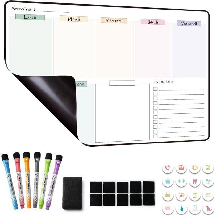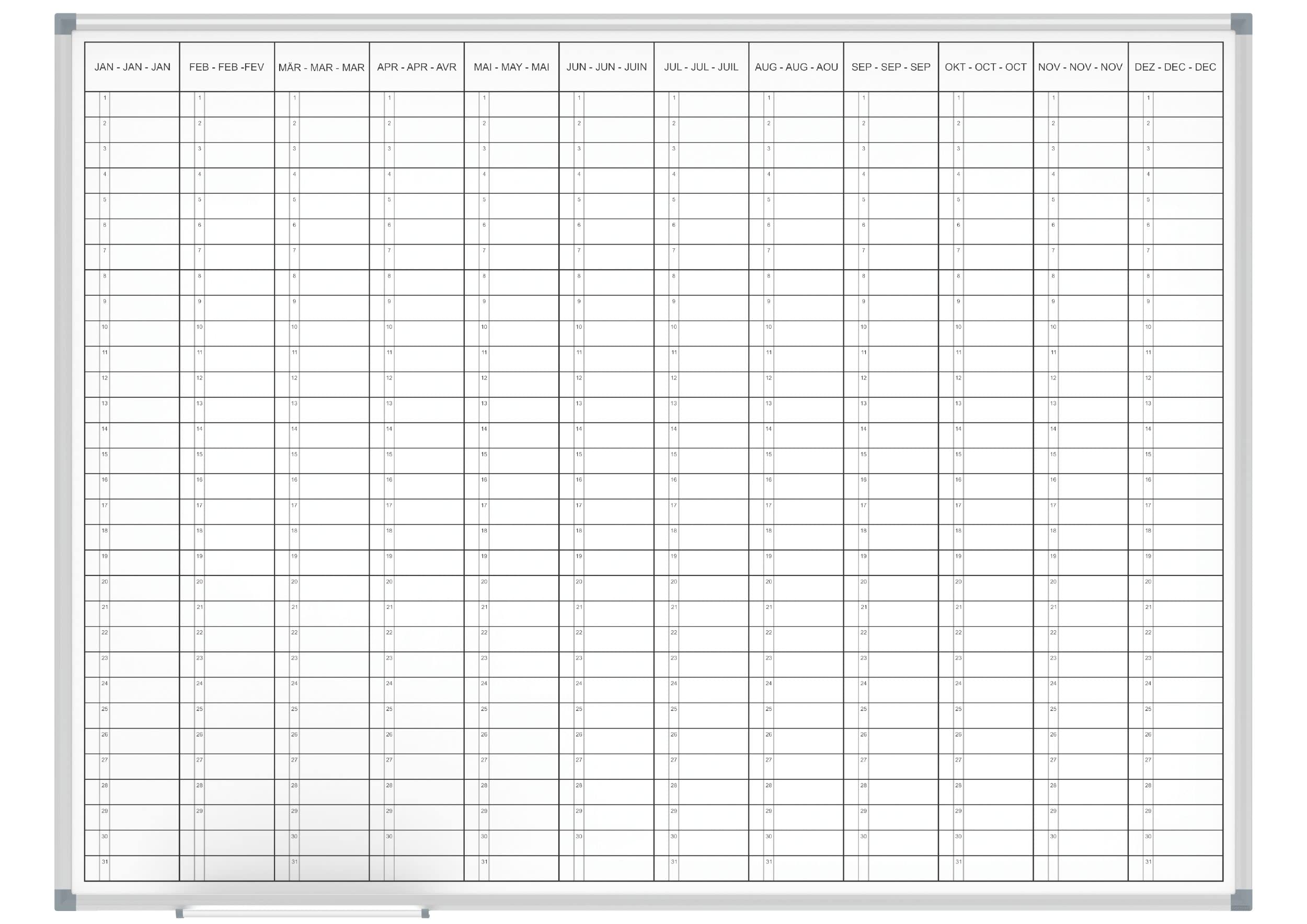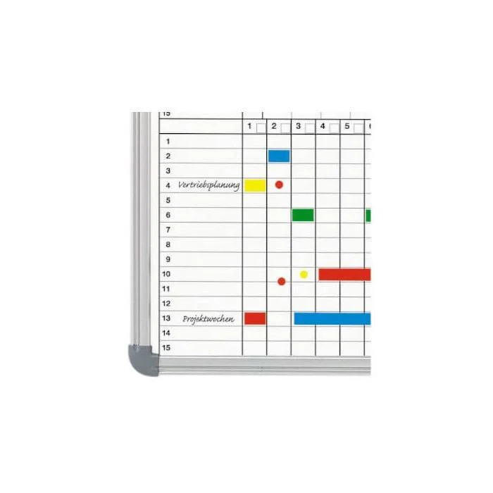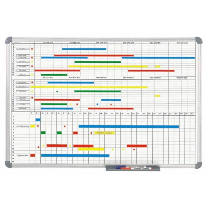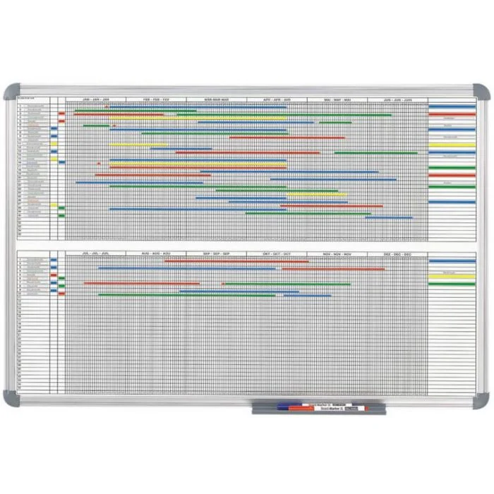 Tableau Aimanté Mural Planning Bi-Office Annuel Pepu00e9tuel Magnu00e9tique - Dim. L90 X H60 Cm Blanc Gris/w 4 Planning Annuel Tableau Planification Annuel Maul Panneau Gestion De Planning | Com'Un Panneau Organisation Projet Personnel Avec lui, vous pouvez assurer une organisation optimale dans votre entreprise et augmenter la productivité. Qualité supérieure - Conçu par MAUL - Planificateur annuel au format annuel avec 2 mois de surplombage - Idéal pour planifier des vacances - Pour planifier jusqu'à 43 personnes ou objets - Informations sur les activités, le personnel et les projets, les machines - Surface de travail en tôle d'acier revêtue de plastique, convient pour une utilisation fréquente - Très stable : cadre en aluminium anodisé argenté - Pour une organisation moderne, flexible et rapide - Même les planches complexes Travail et flux de travail e sont rapidement visibles - Changements rapides possibles - Poids léger : facile à transporter et à monter - Triple utilité : magnétique, inscriptible et effaçable à sec - Plateau de rangement en aluminium de 50 cm de long - Profil discret en combinaison avec des raccords d'angle en gris - Les indications de couleur se réfèrent aux raccords d'angle - 2 x 7 mois, montage variable - Matériel de montage inclus La surface de travail en acier extra solide et la surface en plastique robuste le rendent idéal pour une utilisation permanente. Tableau pour planning annuel et mensuel. Zone supérieure avec 2 x 6 mois. Zone inférieure de 31 jours. Magnétique et inscriptible. Dimensions : 900 x 600 mm Le cadre en aluminium anodisé argenté confère à l'agenda une grande stabilité avec un poids léger, et le plateau de rangement coulissant en plastique offre une utilité supplémentaire. Planning pour l'année entière avec 2 mois supplémentaires. · Dimensions du tableau : 1500 x 1000 mm. · Répartition en 14 mois - 2 x 7 mois. · Surface de travail en... Grâce à la possibilité d'impression personnalisée, l'agenda peut être personnalisé pour répondre aux besoins spécifiques de votre entreprise. Notre planificateur annuel MAUL offre une solution parfaite pour la planification claire des activités, du personnel, des projets et des machines.