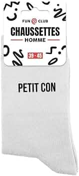 Accessoire Décalé Chaussettes Homme STC 'Petit Con' Noir - Taille Unique 39-45 - Humour Et Confort Basette Texte Drôle Chaussettes homme | LE PETIT PARIS CHAUSSETTES NOIRES PETIT CON HOMME. Découvrez nos chaussettes à messages, à la fois pailletées et fun, pour égayer vos pieds avec des mots mignons ou un brin d’humour (même un peu piquant Chaussettes Cadeau Homme Marrant Chaussette Pour Homme | Accessoires Chausette Connasse À la recherche d'une paire de chaussettes originale et humoristique qui tient au chaud ? Notre paire de chaussettes Petit Con est la paire idéale !