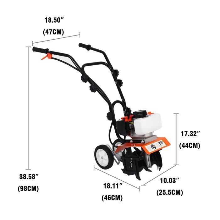 - Nombre de lames : 4., - Cylindrée : 52 cm3., - Puissance : 1700 W - Vitesse : 6500-7000 tr/min - Type de carburant : #93., - Rapport carburant : 25:1., - Capacité du réservoir de carburant : 850 ml. - Type de moteur : 2 temps, monocylindre, refroidi par air - Réglage de la vitesse : réglage en continu de la vitesse. **NOTICE** - Veuillez lire attentivement les instructions et suivre les précautions pour garantir une meilleure expérience. Contenu de la livraison : - 1 motoculteur. - Taille des roues : 18 cm. Largeur de travail : 30cm, profondeur réglable de 3 à 12cm. Il a 4 lames en acier au manganèse, des roues de 18cm, et pèse 15kg - assez maniable pour ton jardin... Motobineuse Thermique Motoculteur 2 Temps à Essence 52 Cc 1,9 KW Motoculteur, Fraise De Jardin, 6500-7000r/min 35 Cm De Profondeur, 3-10 Cm De Largeur De Travail Motoculteur Occasion - 2 x manuel en anglais. - **Surface de travail large ** : largeur de travail de 30 cm avec 4 lames stables pour de grandes surfaces en moins de temps - Veuillez noter que de légères variations de couleurs sont possibles en raison de la lumière de prise de vue et une erreur de mesure possible de 1 à 6 cm en raison de la mesure manuelle. - Dimensions du produit (l x h) : 50 x 87 cm. Motoculteur Jardin 4 Lames Motoculteur à Essence Moteur 4T 7CV 212 Cm3 Motobineuse Thermique Avec Motobineuse 52cc 1700W Motoculteur thermique moteur essence 6.5 CV 196 CC pas cher - Dimensions du moteur (L x H) : 28 x 44 cm. - Traitement de surface : revêtement par pulvérisation. - Diamètre de la lame : 22 cm. Caractéristiques : - Matériau : fer, aluminium, acier au manganèse, caoutchouc - Couleur : noir, rouge., - Style : moderne. - Poids net : 13,85 kg. - **Profondeur de culture réglable** : profondeur réglable de 3 à 12 cm pour différents besoins de sol