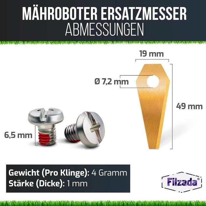 Image de pelouse : grâce à nos lames, vous profiterez d'une coupe de première classe et d'une pelouse saine grâce à leur longévité. Compatibilité : grâce à une fabrication précise, nos lames de rechange revêtues de titane sont compatibles avec les robots à gazon des modèles courants de Bosch Husqvarna et bien plus encore. Les lames de tondeuse robotique garantissent les bords de coupe les plus fins et une image de pelouse propre. Test : tondeuse robot Bosch Indego S+ 500 avec application et accessoires Les vis sont équipées d'un vernis de sécurité, qui protège contre le dévissage indésirable des vis pendant le processus de tonte. Sur , retrouvez un large choix de lames de rechange compatibles avec les principales marques de robots tondeuses. Veillez à bien vérifier la compatibilité des lames avec votre modèle de robot tondeuse avant de finaliser votre achat Lames Robot Tondeuse Powerplus POWACG9101 Lame De Rechange Pour Tondeuse Robot 3x3 Pièces Lames Tondeuse Robot Ces lames de rechange conviennent pour les tondeuses robot Indego de Bosch. Les lames fines et coudées en acier inoxydable sont parfaites pour tondre le gazon plus rapidement