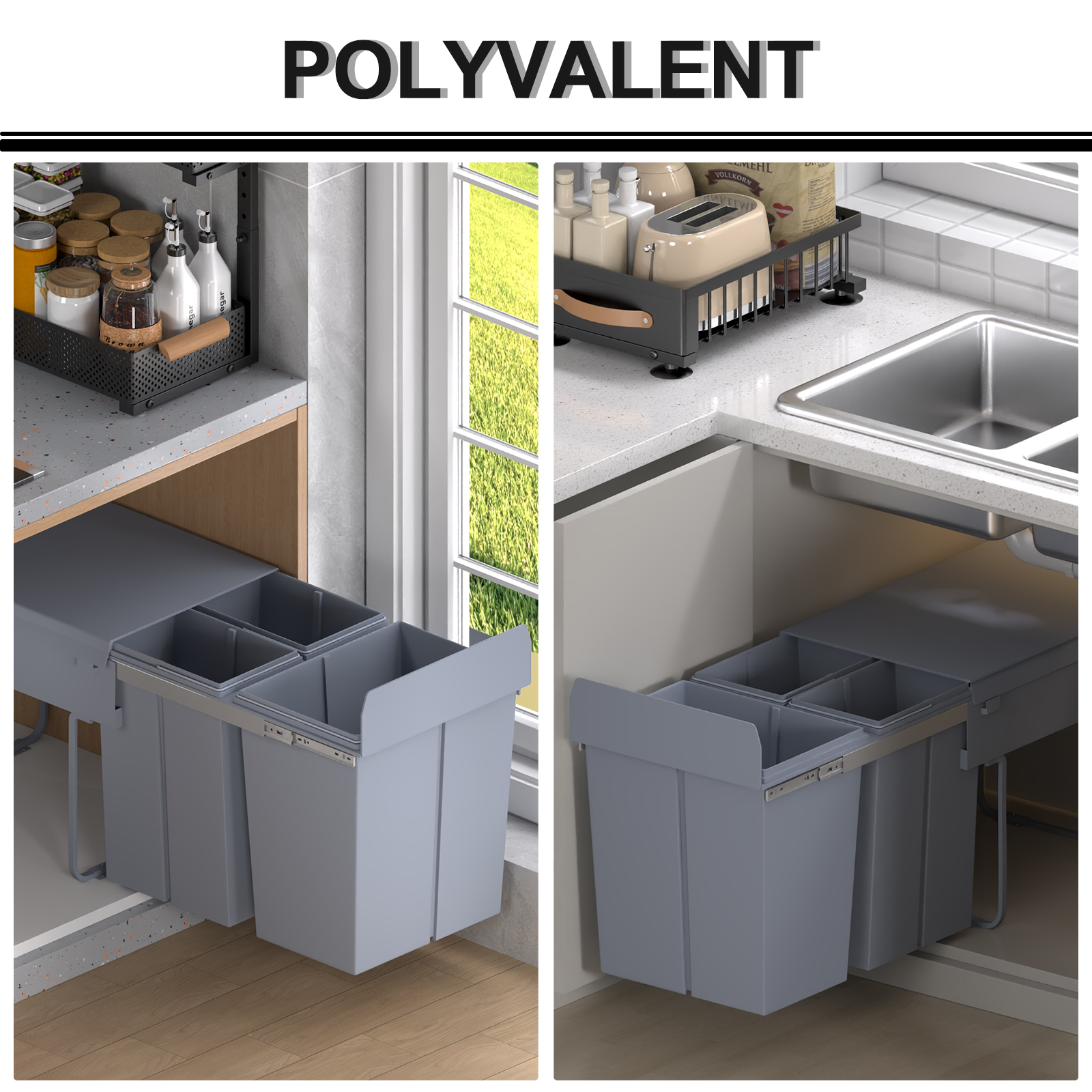 POUBELLE SOUS COMPTOIR GAIN DE PLACE : Avec ses dimensions de 52L x 33,5l x 41H cm, ce modèle intégré s'insère parfaitement sous votre plan de travail pour maximiser l'espace au sol tout en minimisant les vidages fréquents, éloignant les déchets des enfants pour un nettoyage de la cuisine plus rapide et plus efficace. 851-073V01GY● Note: Si vous souhaitez la reprise de votre ancien produit, merci de consulter nos CGV sur les modalités de reprise et de nous joindre via la messagerie. Hailo - Poubelle de cuisine Hailo Tandem 31L encastrable 2 bacs amovibles Le bac sous évier HOMCOM, doté d'une structure en métal solide, glisse silencieusement pour un accès facile et un tri simplifié grâce à ses deux compartiments Les bacs intérieurs, équipés de poignées, facilitent leur extraction sans dégâts. Poubelle de cuisine tri sélectif 2 bacs encastrable sous évier 30L (15 CONÇUE POUR DURER : Construite avec un couvercle en ABS, un bac intérieur en PP et une armature métallique, cette poubelle est conçue pour être robuste et résister à la déformation. Sa finition anti-traces garantit une apparence impeccable durablement. Rangement Déchets Recyclage HOMCOM Poubelle Cuisine, Poubelle Sous évier Coulissante Encastrable Avec 2 X 20 L Compartiments Amovibles, 52x33,5x41cm, Gris | France 2 Compartiments 20L Amovibles HOMCOM Contenu de L'Emballage: Il assure un ordre durable et améliore votre routine quotidienne. Caractéristiques:● Le design caché en armoire garde votre cuisine ordonnée et à l'abri des petits ● Deux bacs de 20L de la poubelle de cuisine offrent une capacité de 40L pour un tri facile des déchets ● Des rails fiables assurent une glisse douce et silencieuse pour un accès facile d'une seule main ● Son couvercle dépoli sert d'étagère pratique pour un rangement supplémentaire ● Les seaux intérieurs sont amovibles avec des poignées, simplifiant les tâches de vidage et de nettoyage ● Cette poubelle sous évier en cadre métallique robuste pour un soutien fiable et résistant ● Le design pré-assemblé permet une installation rapide et facile en quelques minuteSpécifications:● Couleur : gris ● Matériau : PP, ABS, métal ● Dimensions totales : 52L x 33,5l x 41H cm ● Capacité : 20L x 2 ● Réf.