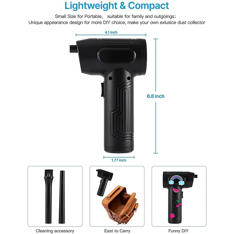 [Utilisation polyvalente, nettoyage sans souci] Ce plumeau électrique convient à la maison, au bureau, à l'atelier, aux appareils électroniques, aux espaces domestiques, à l'intérieur des voitures, aux outils et appareils électroménagers, etc. [Portable et écologique]Son design compact et confortable le rend facile à prendre en main. Il comprend également 9 brosses accessoires adaptées à différents endroits. XJUGEZ Souffleur Poussière Ventilateur,Souffleur D'air Comprimé Sans Fil 51000 RPM Souffleur D'air Nettoyage Poussière électronique EN STOCK : Souffleur d'air comprimé pas cher. Grand choix, promos permanentes et livraison rapide partout en France. Paiement sécurisé Ce souffleur XJUGEZ est une tuerie pour nettoyer sans bombes jetables ! Vitesse max de 180 000 tr/min, avec 4 niveaux de puissance (jusqu'à 60 min d'autonomie Nettoyeur USB - Souffleur d'air électrique - Sans fil - Noir - Remplace