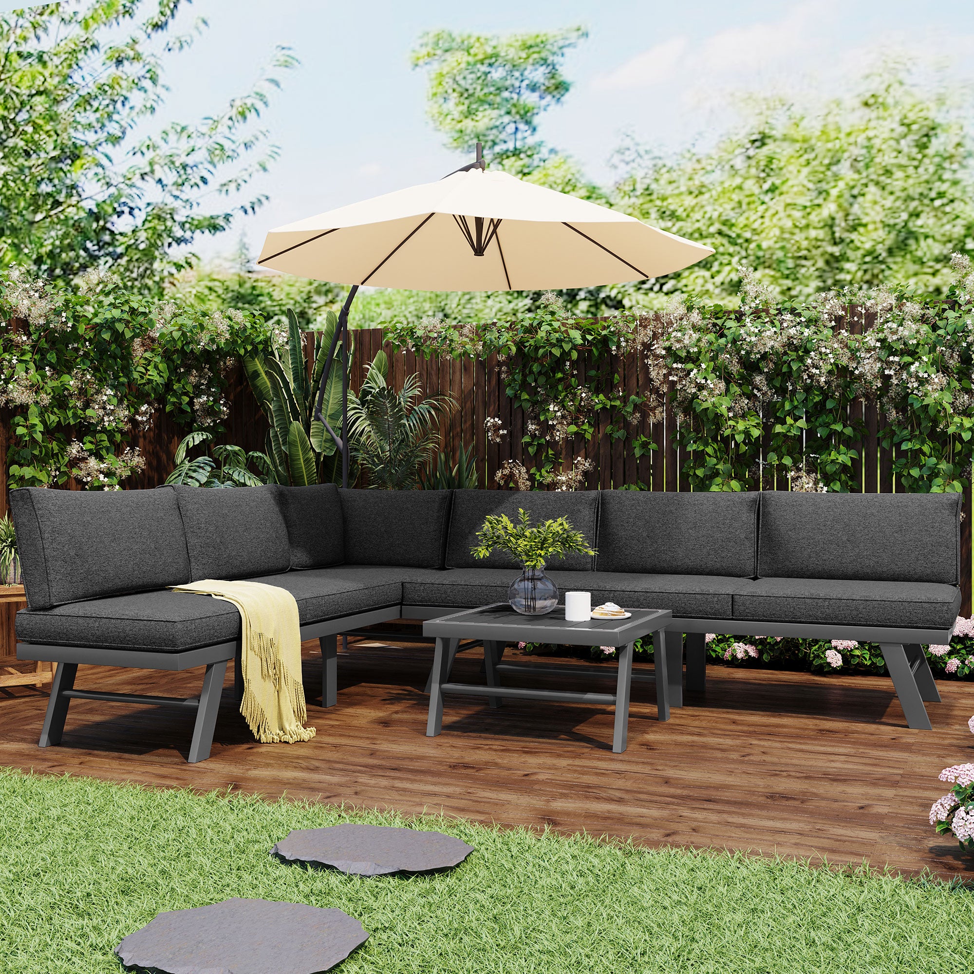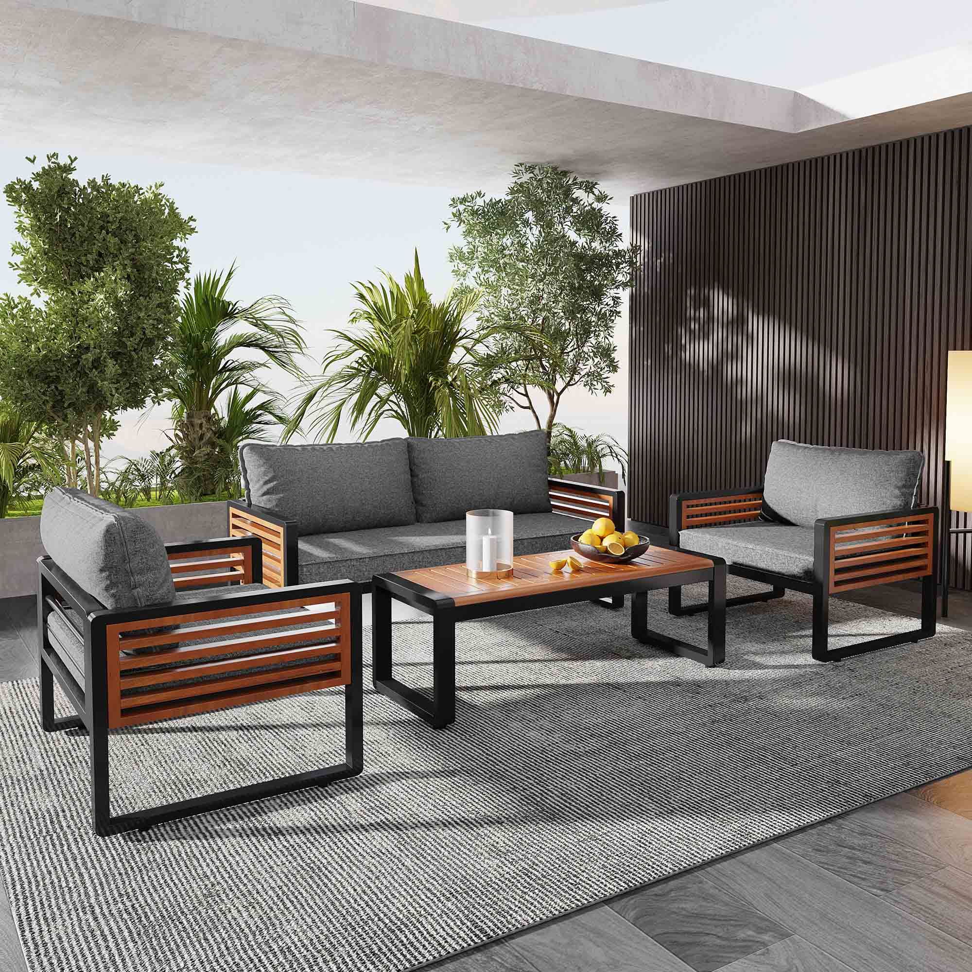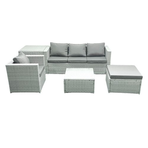 Description : Ce salon de jardin comprend deux canapés 2 places, un canapé individuel avecpetites tables sur les côtés, et deux tables basses empilables. EN STOCK : Salon de jardin 6 personnes pas cher. Grand choix, promos permanentes et livraison rapide partout en France. Paiement sécurisé Son design modulaire permet de s’adapter à différents espaces., 1., Caractéristiques du produit : Matériau : Fer, verre renforcé, plaque en plastique Couleur : Gris Dimensions : Canapé deux places 1 : 123,5*58*66 cm Canapé deux places 2 : 116*58*66 cm Siège individuel avec table des deux côtés : 124,5*65,5*66 cm Grande table : 40*35 cm Petite table : 60*40 cm Poids : 52., 1 kg Charge maximale : 150 kg/place individuelle, 60 kg/table Emballage : 2 paquets Assemblage requis : oui 2., Scénarios d'utilisation à domicile: Ce salon est idéal pour les terrasses, jardins, ou balcons, parfait pour 5 à 6personnes. La structure assure une stabilité accrue et un usage durable. 【Pratique et fonctionnel】:Le canapé individuel dispose de petites tables sur les côtés, permettant de placer facilement des boissons, livres ou appareils électroniques. Belgique Pas Cher Salon De Jardin 4 Places En Rotin Et Acier - 1 Canapé 2 Places + 2 Chaises + 1 Table Basse En Housses Amovibles Lavables 【Salon de jardin extérieur 5/6 personnes】:Ce salon élégant comprend deux canapés 2 places, un canapé individuel avec petits tables intégrées et deux tables basses empilables. 【Tables basses pratiques et modulables】:Les deux tables basses sont conçues pour être empilées et économiser de l'espace. Elles peuvent être utilisées indépendamment ou en combinaison pour s’adapter à divers besoins. Idéal pour 5 à 6 personnes, il est parfait pour les jardins, terrasses ou balcons. Salon De Jardin En Acier Galvanisé Avec Coussin Gris : Table Basse Et Deux Canapé 3 Places Avec Fonction De Basculement Il offre une excellente posture et relaxation, tout en étant facile à entretenir grâce aux housses amovibles et lavables. Ce mobilier est conçu pour accueillir confortablement jusqu'à 6 personnes, offrant ainsi une expérience de détente sans compromis. Charge maximale : Chaque siège peut supporter jusqu'à 150 kg, garantissant une assise confortable et stable pour toutes les tailles