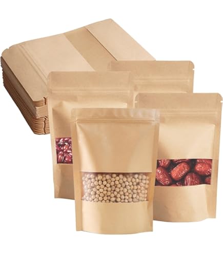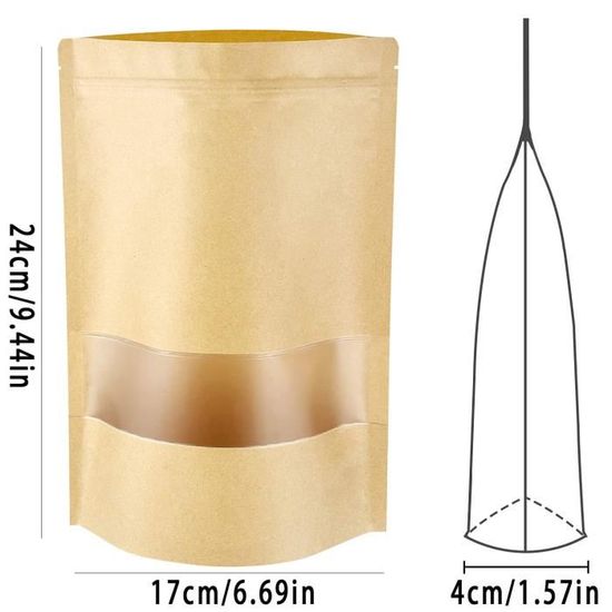Sacs en papier Kraft à fermeture éclair, avec fenêtre, sac de rangement auto-scellant pour aliments, collations, thé, mariage, maison, bonbons, cadeaux, pochette d'emballage, 20/50 pièces Plus de détails : Matériau : alliage Papier kraft Couleur : noir Marron Taille : 1 9 x 14 cm, 14 x 20 cm, 17 x 24 cm Quantité : 150 pièces Emballage Alimentaire Kraft Café Thé Lot De 30 Sachets En Papier Kraft Avec Fenêtre - Réutilisables - 30 X 18 Cm - Marron - Pour Noix, Grains De Café, Feuilles De Thé, Bonbons, Collations Sachet Craft Alimentaire Description du produit Ces sacs à fond plat sont fabriqués en papier kraft de haute qualité, qui a une forte ténacité, une capacité de charge élevée et ne se déchire pas facilement Utilisation polyvalente : les sacs en papier kraft sont parfaits pour ranger des feuilles de thé, des grains de café, du sel, des bonbons, des collations, des noix, des graines, des épices, des biscuits, des haricots et des herbes séchées, etc Contenu de la livraison : vous recevrez 150 sacs en papier avec fenêtre en trois tailles, à savoir 9 x 14 cm, 14 x 20 cm, 17 x 24 cm, une quantité suffisante pour répondre à vos différents besoins de conservation des aliments Sacs et sachets - Marron - A4 plus - Avec fenêtre Sachets Kraft Alimentaire 200 Sachets Kraft Zip 14x20cm Avec Fenêtre - Stockage Alimentaire Thé, épices Sac Alimentaire Avec Fenêtre Les sacs de rangement ont une encoche en forme de U pour une ouverture facile et une fermeture éclair pour une ouverture et une fermeture faciles Matériau : ces sacs sont fabriqués en papier kraft de qualité supérieure, qui a une forte ténacité, une capacité de charge élevée et ne se déchire pas facilement. La face avant des sacs en papier kraft est munie d'une fenêtre transparente