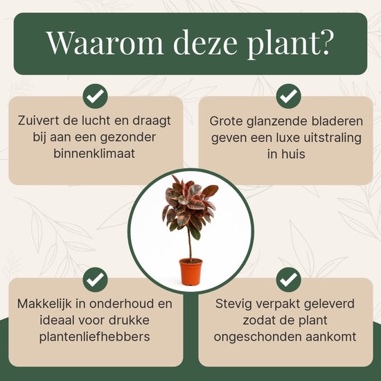 Il a des feuilles panachées roses, ce qui en fait une plante d'intérieur magnifique! L'hévéa doit son nom au fait que ses feuilles servait autrefois à fabriquer le caoutchouc. Soyez prudent, car le Ficus Be:oze est toxique pour les enfants et les animaux. Le Ficus Belize a besoin d’eau environ une à deux fois par semaine. L'hévéa, en latin Ficus Elastica Belize, est une plante purificatrice d'air robuste qui peut résister à de nombreux environnements. La plante a une hauteur de 75 à 100 cm à la livraison, mesurée avec le pot de pépinière. Soins des plantesLe Ficus Elastica Belize est une plante d'intérieur très facile à entretenir. La plante élastique aime un emplacement lumineux, mais essayez d'éviter la lumière directe du soleil, ne placez donc pas la plante trop près de la fenêtre De plus, le Ficus préfère une température d’au moins 15 degrés. De cette manière, votre commande est protégée contre tout dommage éventuel pendant le transport. Plante Verte Ficus Elastica Belize Tronc - 130 Cm - ø24 130cm - Plante D'intérieur Arbre De Jade Le Ficus elastica 'Belize' séduit par son feuillage panaché vert-rose et ses propriétés dépolluantes. Une plante d'intérieur moderne, solide et apaisante Cela en fait une plante remarquable et belle dans la maison! Plante caoutchouc entreten comment cultver le fcus elastca – Artoft Finalement, l’hévéa peut atteindre jusqu’à 2 mètres de haut dans un pot spacieux ! L'hévéa grande plante d'intérieur, en latin Ficus Elastica Belize, est une plante purificatrice d'air robuste qui résiste à de nombreux environnements. Entre mars et septembre, le Ficus aimerait recevoir régulièrement un peu d'engrais végétal. Achetez maintenant une plante d'intérieur 4x Calathea - Mélange Plantes Il est conseillé d'enlever les feuilles de temps en temps pour favoriser la croissance, car elles peuvent accumuler beaucoup de poussière. Le Ficus appartient à la famille des plantes Moraceae, ou famille des Mûriers. Le Ficus Elastica Belize se caractérise par ses feuilles panachées, d'une belle couleur rose. La plante a besoin de peu d'eau et résiste bien aux insectes.