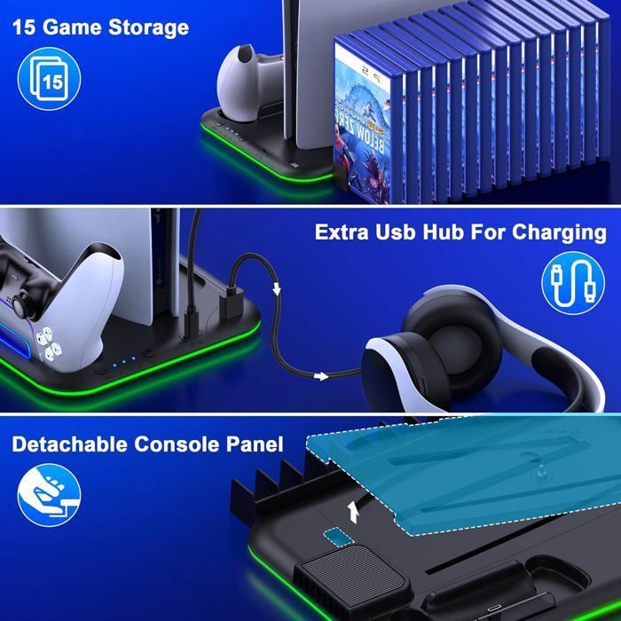 Merci de votre compréhension S'il vous plaît permettre 1 - 2cm différence de mesure en raison de la mesure manuelle., 1., Ventilateur de dissipation de chaleur avancé: ce ventilateur de dissipation de chaleur RGB est compatible avec ps5 Pro / ps5 slim et dispose de trois ventilateurs pour une dissipation de chaleur efficace. Spécifications: Modèles applicables: compatible avec ps5 Pro / ps5 Slim host lecteur optique version et version numérique Matériel: ABS Remarque: la couleur réelle de l'article peut être légèrement différente de l'image en raison des différents paramètres du moniteur et des conditions d'éclairage. Il garantit que votre console reste fraîche pendant le jeu intense, offrant une expérience transparente avec un minimum de bruit., 2., Système de refroidissement efficace: ce ventilateur est équipé d'un système de refroidissement efficace qui peut aider votre hôte à refroidir rapidement. Support de ventilateur de refroidissement pour Console PS5/PS5 Un système de refroidissement efficace garantit des performances optimales afin que vous puissiez profiter d'un jeu ininterrompu., 3., Ventilateur de refroidissement USB multifonctionnel: le ventilateur de refroidissement USB comprend un port USB externe qui vous permet de charger le Contrôleur ou de connecter d'autres périphériques USB. Avec trois puissants ventilateurs de refroidissement montés directement sur la sortie d'air de la console, notre ventilateur PS5 est la solution de dissipation thermique la plus puissante et la plus efficace pour garantir des performances optimales pour des sessions de jeu de longue durée Support de ventilateur de refroidissement pour Console PS5/PS5 Slim, refroidisseur Vertical avec lumière LED, chargeur double manette de jeu pour accessoire de refroidissement PS5 acheter à prix bas - livraison gratuite, avis Avec des ventilateurs silencieux à grande vitesse à 3 niveaux, il ventile efficacement l'air chaud de votre console, un refroidissement 388374420304 MODE...