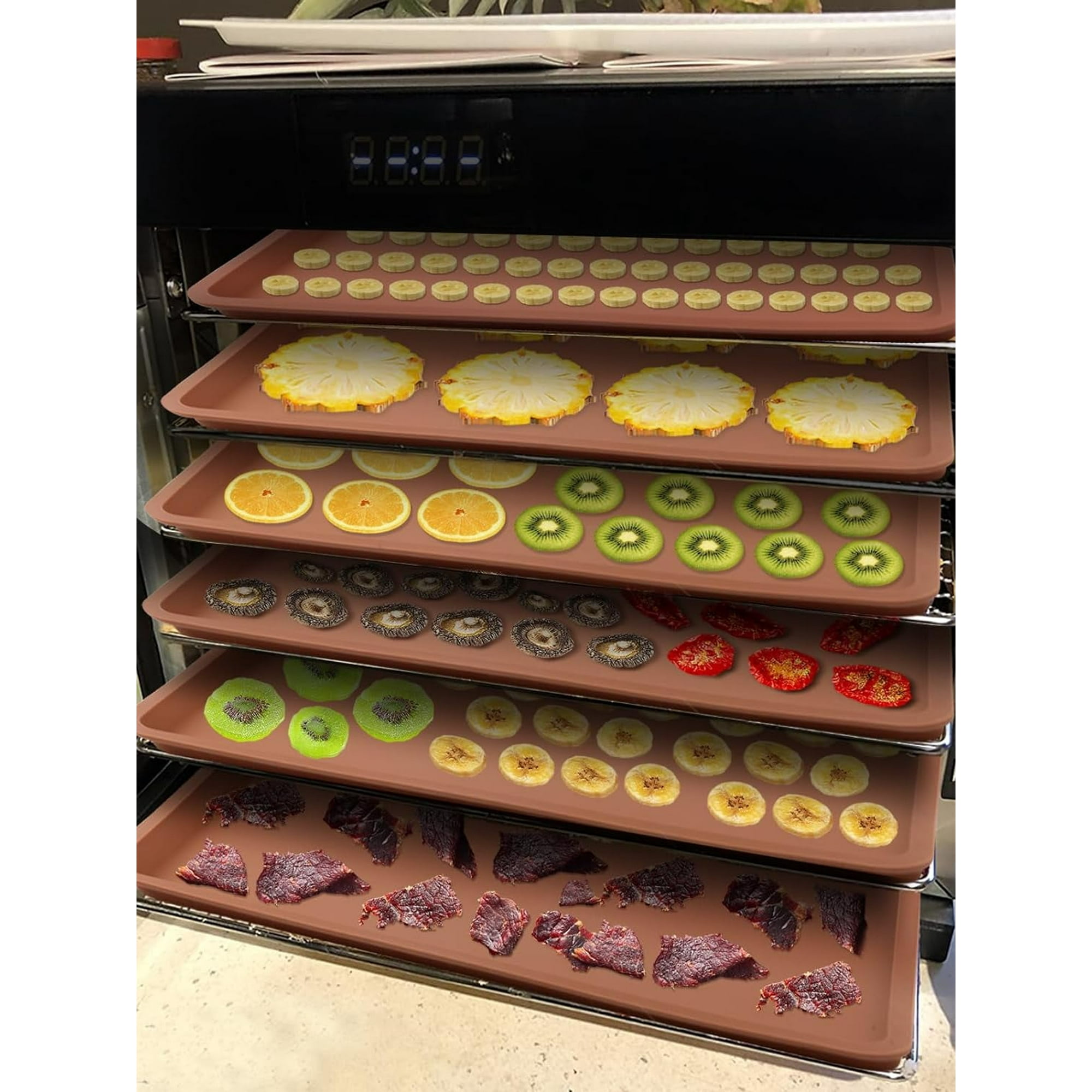 Accessoire Déshydrateur Fruits Viandes Lot De 6 Tapis De Déshydrateur En Silicone Avec Bord Pour Tapis Déshydrateur Silicone Large application : nos feuilles de déshydrateur en silicone sont parfaites pour faire des rouleaux de fruits, des écorces de fruits, des fruits déshydratés, des rouleaux d'aubépine, des légumes, des gâteaux séchés, des gâteaux aux herbes, des soupes sèches ou des sauces, et plus encore. Matériau de haute qualité : les plateaux à fruits du déshydrateur sont fabriqués en silicone 100 % de qualité alimentaire, sans , sûr, non toxique, antiadhésif, ne se déforme pas lorsqu'il est chauffé, facile à nettoyer et réutilisable Résistant aux hautes températures : les feuilles de déshydratation en silicone peuvent résister à des températures allant de -65,6 °C à 230 °C, peuvent être utilisées dans les déshydrateurs et les fours, une bonne aide dans la cuisine Couleur : marron et orange. Il est également idéal pour les gâteaux roulés suisses. Tapis De Déshydrateur En Silicone Avec Bord, Empêche Le Collage Et Les Matériau fiable : les plateaux à fruits sont fabriqués en silicone de qualité alimentaire, résistants à des températures de -40 °C à 240 °C, sans danger pour les déshydrateurs alimentaires, antiadhésifs et réutilisables. Vous pouvez utiliser de l'eau chaude et une éponge pour nettoyer et passer au lave-vaisselle. Résistant au froid et à la chaleur. Utilisations multiples Idéal pour faire du cuir de fruits, des rouleaux de fruits, déshydrater des fruits, des légumes, des herbes et de la viande. La plage de température tolérée est de -40 °C à 240 °C. Lorsque vous faites des pelures et d'autres repas désordonnés, ainsi que des soupes et des sauces sèches, vous n'avez pas à vous soucier de renverser. Design avec des bords étroits : les bords surélevés de ces tapis déshydrateurs empêchent les liquides de se renverser et aident à conserver les nutriments. Compatible avec : Compatible avec Cosori CP267-FD et plus.