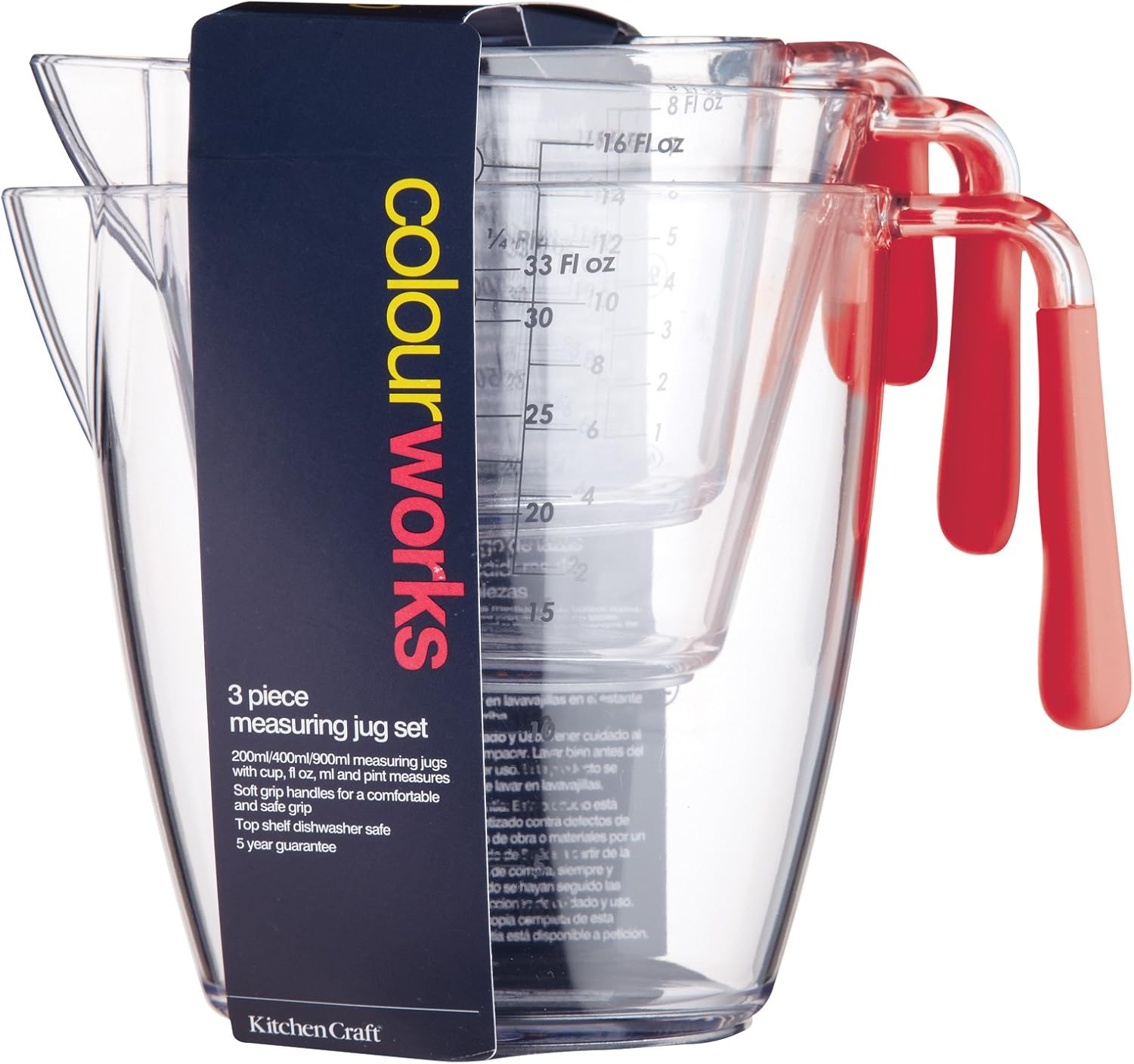 This set includes a 200 ml jug, a 400 ml jug and a 900 ml jug. 3-Piece Measuring Jug Set – Durable & Pour Measuring Cups Each jug is clearly marked with fluid ounce (fl oz), millilitre (ml), pint (p) and cup (c) measurements, making it easy to follow recipes – even those featuring American measurements. With the Kitchen Craft Colourworks range, you can easily combine or contrast to bring a brilliant burst of colour to your kitchen. Using a variety of materials across the whole collection, including flexible LFGB grade, food-safe silicone, strong stainless steel, virtually unbreakable melamine and durable nylon, each product in our range provides fantastic performance whatever the cooking task. Verre Doseur Millilitres Cups COLOURWORKS 3 Piece Measuring Jug Set - Rouge Mesure Millilitres Et Cups Whether you’re blending the ingredients for a simple vinaigrette in the smallest jug or using the 400 ml jug to whip up cream, there’s no need to worry about dropping these jugs with their safe grips. Choose from hundreds of tools and accessories in red or one of our 10 other gorgeous shades today!, ., About Colourworks. Don't let the fun colours fool you, this is seriously high performance kitchen kit, designed to deliver incredible reliability on a daily basis. You can either pop them on your dishwasher’s top shelf, or hand wash them with warm water. Sareva chez | Department Store The perfect space saver for kitchen shelves or cupboards, you can also handily stack each of these jugs inside of each other. Avec cet ensemble de tasses à mesurer de Colourworks, vous pouvez être sûr que toutes vos recettes se dérouleront comme prévu. Vous aurez tout mesuré avec précision en un rien de temps