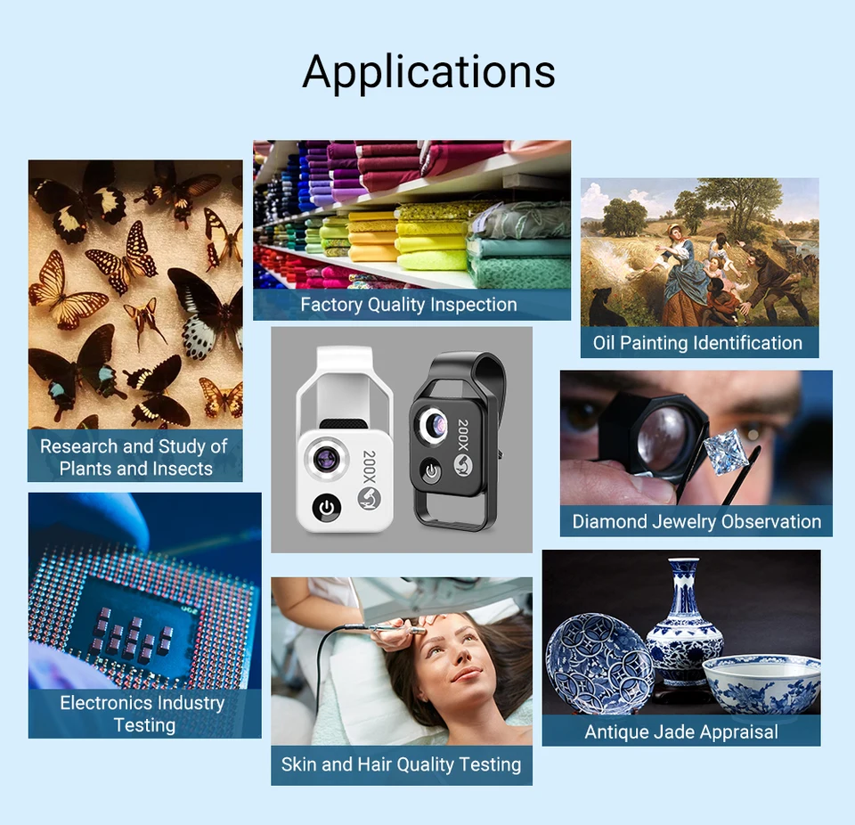 Turn Your Phone into a 200x Microscope with Apexel 200X! – APEXEL Official Parfait pour inspecter rapidement des feuilles, des tissus, des circuits imprimés ou même pour analyser votre peau ! Microscope LED Portable Objectif Macro Iphone APEXEL Explore Micworld Lot De 200 Mini Microscopes Pour Phone Repair Microscope Lentille Clipable Exploration Microscopique Transformez votre smartphone en microscope ! Le clip universel convient à presque tous les smartphones, rendant la microphotographie effortless. Ce microscope pour smartphone est l'outil ultime polyvalent pour les esprits curieux de tous âges. Insectes, plantes, bijoux... tout devient fascinant ! Avec éclairage LED réglable et filtre CPL pour des images nettes. Parfait pour les kids curieux ou les... Exploration Micro-monde Microscope Téléphone APEXEL 200X - Lentille Clipable - - Noir Lentille Clipable 200x Installation simple, résultats instantanés : Aucune application ou réglage compliqué. Double éclairage LED pour des images nettes : Dispose d'une luminosité réglable sur 3 niveaux pour éliminer les ombres et sublimer les détails. Parfait pour les hobbyistes, les éducateurs et les esprits curieux.