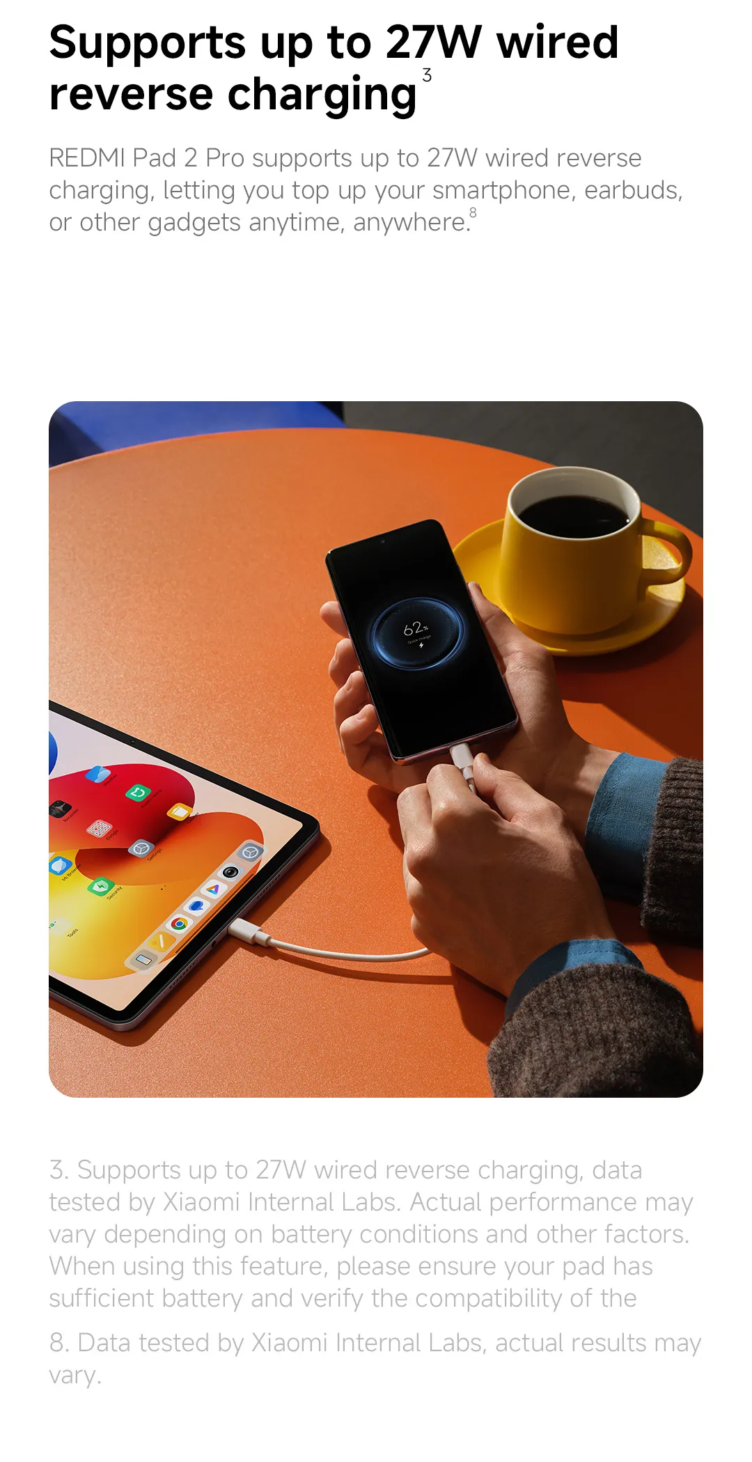 Supports up to 27W wired reverse charging:REDMI Pad 2 Pro supports up to 27W wired reverse charging, letting you top up your smartphone, earbuds, or other gadgets anytime, anywhere. 12., 1 2., 5K crystal-clear display:REDMI Pad 2 Pro features a 12., 1-inch 2., 5K crystal-clear display that delivers sharp details and vivid, lifelike visuals with support for over 1., 07 billion colors. Snapdragon 7s Gen 4 Mobile Platform:With the Snapdragon 7s Gen 4 Mobile Platform at its core, REDMI Pad 2 Pro unleashes powerful performance for ultra-smooth, all-immersive entertainment. title The #REDMIPad2Pro is now available in a powerful 5G version! Featuring a stunning 12.1 2.5K display and a massive 12,000mAh (typ) battery ⚡️ Starting at just $449 - includes a FREE Home screen+:Directly operate your Xiaomi smartphone from REDMI Pad 2 Pro, use apps or files from your Xiaomi smartphone, and even pin phone apps to the pad for seamless use Découvrez la Xiaomi Redmi Pad 2 Pro : une tablette performante avec écran 12,1", Snapdragon 7s Gen 4, 6 Go RAM, 128 Go stockage, et une batterie de 12 000 mAh écran 12.1 Pouces 2.5K 12000mAh XIAOMI Redmi Pad 2 Pro – 12.1 Inch 2.5K Tablet (Snapdragon 7s Gen 4, 6GB RAM, 128GB ROM, WiFi 6 + Bluetooth 5.3, 12000 MAh Battery, Charger Not Included), Grey (ES Version Batterie 12000 Mah Tablette 12.1 2.5K crystal-clear display:REDMI Pad 2 Pro features a 12.1-inch 2.5K crystal-clear display that delivers sharp details and vivid, lifelike visuals with support for over 1.07 billion colors
