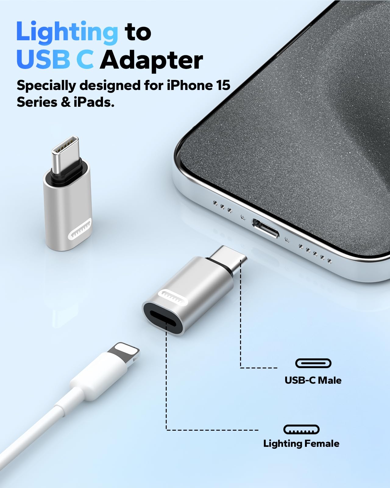 Il ne prend PAS en charge l'écouteur, le stylet de 1ère génération, la souris, le clavier, la clé USB, le lecteur de cartes, l'imprimante, le microphone, le convertisseur HDMI, la caméra. Remarque Importante: L'adaptateur Lightning femelle vers USB C mâle prend uniquement en charge le chargement et le transfert de données entre appareils. MoKo Lot de 2 adaptateurs Lightning femelle vers USB-C mâle, Compatible avec iPhone 15/16, iPad, Samsung Galaxy, Google Pixel, etc., Charge Rapide 35W PD, Blanc PD Son interface USB 3,0 a un taux de transfert de données allant jusqu'à 480 Mbps, ce qui rend la synchronisation des données plus sûre et efficace pour l'iPhone de la série 15 et d'autres appareils de Type C Il est parfait pour le bureau, la maison, le voyage et la voiture. Adaptateur Mfi Compatible Adaptateur Lightning Vers USB-C (2 Pièces) - Charge Et Transfert Pour IPhone 15/16, IPad Connecteur USB-C Vers Lightning Compatibilité Universelle: L'adaptateur USB-C est une solution idéale pour connecter des appareils USB C au câble Lightning. Il est largement compatible avec iPhone 16/16 Pro/16 Plus/16 Pro Max, iPhone 15/15 Pro/15 Pro Max/15 Plus, iPad Pro 11, iPad Air 5e/4e Gén, iPad Mini 6e Gén, Google Pixel 7/6/5/4, Galaxy Z Flip 5, Galaxy Z Fold 5, Galaxy S23/S23 Ultra/S23+/S22/S21/S21 Plus/ S20/Note 20/ 20 Ultra/ 10/ 10 Plus, HTC U12, LG V50 et autres appareils USB C. Transfert Données Usb 3.0 MoKo Adaptateur Lightning Vers USB C Lot De 2, Adaptateur USB C Vers Lightning Pour IPhone 16/16 Pro/16 Pro Max/iPhone 15 Pro Max Plus, Pour Charge, PAS Pour Écouteurs/Audio/OTG, Noir Ecouteurs Usb C Il ne prend PAS en charge les fonctions vidéo et audio OTG. Andere: Samsung Galaxy, Google Pixel usw. Charge Rapide: L'adaptateur Lightning vers USB C prend non seulement en charge la charge rapide 35W PD (DC20 V/1,75 A) et 27W PD (DC9 V/3 A), mais également rétrocompatible avec une puissance inférieure.