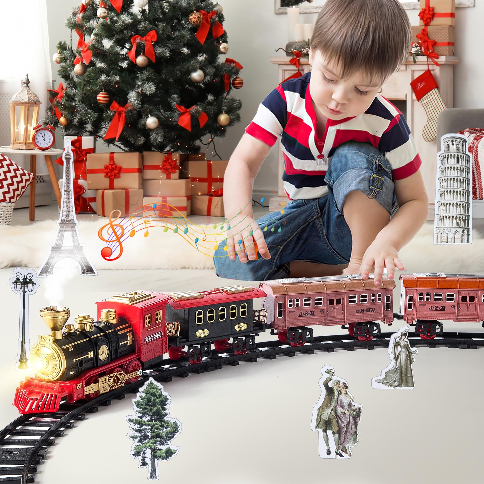 🎄 Train Électrique Télécommandé Complet – Plus de Wagons, Plus de Plaisir ! FRUSE Train Jouet pour Enfants,Train Electrique De Noël avec Fumé, Lumières et Son,Jouet de Train à Vapeur avec Moteur de Locomotive à Vapeur, Wagons de Fret, Cadeau pour Enfants 3 4 5 6 7 8 9 Ans Marque : FRUSE 4,1 (494) 4199€ Prix le plus bas des 30 derniers jours Ce coffret festif comprend 1 locomotive à vapeur classique, 1 voiture voyageurs, 1 wagon de marchandises et 1 wagon-citerne de Noël, ainsi que des rails solides formant un circuit circulaire fluide. 💡 Lumières & Ambiance Festive - Les phares fonctionnels de la locomotive brillent intensément pendant que le train circule, diffusant une lueur chaleureuse qui sublime votre décoration de Noël. 🎁 Coffret Cadeau Prêt à Offrir – Un Souvenir Inoubliable Présenté dans une boîte cadeau décorative de Noël, ce train de noël est plus qu'un jouet : c'est un cadeau prêt à l'emploi qui impressionne sous le sapin. Train électrique Train Electrique Enfant Avec Fumée, Lumières & Sons, Train Cadeau Noël Enfant Grâce à la télécommande manuelle, les enfants peuvent facilement démarrer, arrêter et changer de direction. Le mouvement, les lumières et les sons transforment votre salon en une scène féerique. Idéal comme train de Noël électrique pour décorer sous le sapin. 🚂 Fumée Réaliste & Sons Authentiques – Expérience Immersive Ajoutez quelques gouttes d'eau et observez la fumée sûre et inodore s'échapper de la cheminée, comme une vraie locomotive à vapeur. Train Electrique Coffret De Train De Noël à Placer Sous Le Sapin Avec Lumières Musique Train De Noel Electrique Pour Sapin Associés aux sons réalistes du train, ces effets créent une atmosphère immersive qui émerveille les enfants et fascine les adultes. Merveilleux jouets de Noël] Un son et un éclairage réalistes rendent ce train de Noël extraordinaire à tout moment. Effets lumineux et sonores, fumée, lumière et musique, ajoutez de l'eau et de la fumée, incolore et insipide