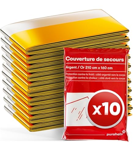 Elle est idéale pour les environnements chauds et la protection contre le soleil direct. La couverture de survie est fabriquée en film PET métallisé, indéchirable et robuste. Cela aide à éviter l'hypothermie. Cette couverture d'urgence est imperméable, coupe-vent et indéchirable, ce qui la rend idéale pour protéger contre les intempéries. Double régulation de la chaleur - Le côté argenté vers le corps protège contre le refroidissement et le froid en cas d'urgence à basse température : le côté doré de la feuille d'aluminium reflète jusqu'à 90 % de la chaleur corporelle. Tiga-Med Lot de 50 couvertures de sauvetage - Doré/argenté - 210 x Dans sa forme pliée et emballée, le sac a une taille d'environ 14 x 8 cm / 5,5 x 3Le poids de la couverture de survie elle-même est de 60 g. Matériau de qualité supérieure : la couverture de survie est fabriquée en film PET résistant à la déchirure et robuste (polyéthylène téréphtalate de polyéthylène téréphtalate), qui possède d'excellentes propriétés d'isolation thermique et peut refléter jusqu'à 90 % de la chaleur corporelle. En suivant ces instructions simples mais essentielles, la couverture de survie peut jouer un rôle crucial dans la préservation de la chaleur corporelle et la protection contre les éléments extérieurs en cas d'urgence ou de situation de survie Couverture PET Métallisée 160x210cm Couverture De Survie,couvertures De Survie Isothermiques,Couvertures De Secours D'urgence,pour Kit 1er Secours Protection contre la chaleur : le côté doré du corps protège efficacement contre les rayons du soleil et la chaleur. C'est un élément important des boîtes de premiers secours, des kits d'urgence et d'extérieur. Lot de 6 couvertures de survie, 210 cm x 160 cm, couverture de survie, or et argent, couverture de premiers secours, couverture de. En 1 fois Alternativement, le film de sauvetage peut également être utilisé comme couverture de sac à dos, poncho, signal d'urgence, protection solaire, protection contre la poussière, insert de sac de couchage, coupe-vent, collecteur d'eau et pour de nombreuses autres utilisations créatives. Compact et portable : la couverture de survie est emballée individuellement dans un sac et donc protégée contre la poussière. Notre couverture chauffante protège parfaitement contre le froid, la chaleur, la pluie, la neige, l'humidité et le vent. Cette taille de la couverture de survie garantit que les enfants et les adultes peuvent être entièrement couverts.