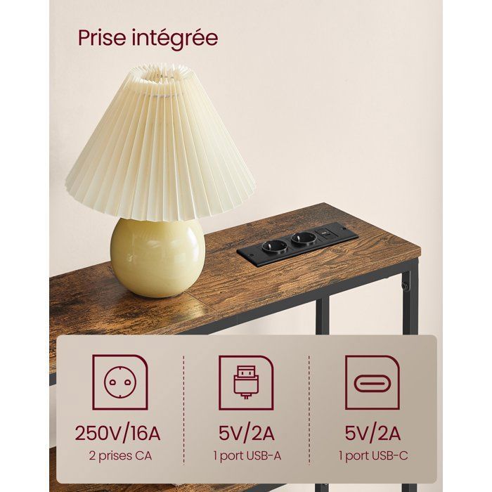 Matériaux : Panneau d'aggloméré, acier Maintiennent cette table étroite en équilibre sur un sol légèrement irrégulier et protègent votre sol des rayures. Fabrication robuste : Fabriquée en panneau d’aggloméré et en acier, elle supporte jusqu’à 30 kg sur l’étagère supérieure et 20 kg sur l’étagère inférieure. Les pieds réglables assurent sa stabilité sur les sols irréguliers, empêchant tout vacillement indésirable Ses 2 étagères offrent suffisamment de place pour poser vos livres, plantes en pot et objets du quotidien, pour une maison parfaitement ordonnée Console étroite 80cm Table Console Bout De Canapé Table D'Appoint Buffet Avec 2 étagères De Table Entrée Salon étroite Capacité de charge statique maximale de l'étagère inférieure : 20 kg Solide et stable : Fabriquée en panneau d’aggloméré robuste et dotée d’un cadre en acier, cette table console supporte jusqu’à 30 kg sur l’étagère supérieure et 20 kg sur l’étagère inférieure. Montage facile : Des instructions claires et des pièces numérotées facilitent le montage. Multiprise intégrée : Doté de 2 prises électriques, de 1 port USB-A et de 1 port USB-C, ce bout de canapé charge simultanément votre lampe, téléphone, tablette et même des guirlandes lumineuses décoratives WOLTU Lot de 2 Table de Chevet Étroit. Table d'Appoint avec Tiroir et... Vous permet de fixer cette console au mur pour renforcer sa stabilité et sécuriser l’environnement. Caractéristiques : Couleurs : Marron rustique, noir d'encre Livraison : 1 x Table console avec prise intégrée, 1 x Kit de montage , 1 x Dispositif anti-basculement , 1 x Mode d’emploi Design polyvalent : Idéale pour les entrées, salons ou près des fenêtres pour mettre en valeur vos plantes. VASAGLE Table Console avec Prise, Bout de Canapé Étroit avec 2 Étagères, 20 x 80 x 80 cm/20 x 100 x 80 cm, pour Salon, Couloir, Entrée, Marron Rustique et Noir d'encre WOLTU Lot de 2 Table de Chevet Étroit. Table d'Appoint avec Tiroir et Capacité de charge statique maximale du plateau : 30 kg