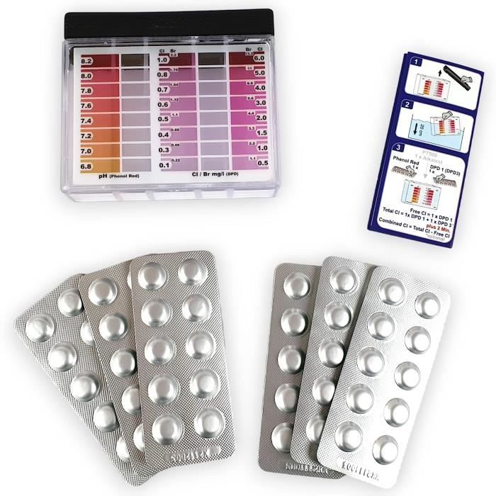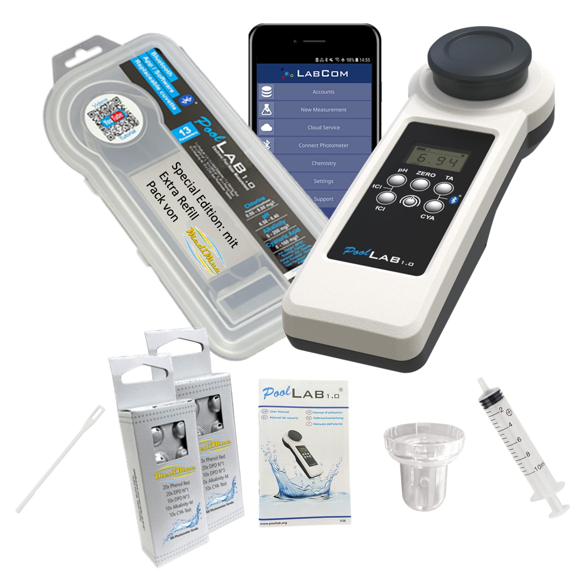 10 pastilles de test CYA. 1 paquet de pastilles de réactifs. Mesure 13 paramètres d'eau avec 6 boutons d'accès rapide. Rincer la cuvette après chaque mesure. Si la cuvette se raye au fil du temps, utilisez la cuvette de rechange. Le testeur numérique PoolLab 1.0 est un photomètre avancé pour l'analyse professionnelle de l'eau des s et des spas. Grâce à sa conception étanche et à sa cuvette intégrée et remplaçable, vous pouvez facilement prélever des échantillons d'eau en immergeant le testeur dans l'eau Photometre Piscine PoolLab 2.0 Avec 70 Pastilles De Test Et Sac, édition Spéciale Pour MediMuc - 24 Paramètres - App, Logiciel - Mesure Jusqu'à 3 Paramètres Dans Un Test Mallette De Rangement Vide Pool Lab Le téléphone visible sur l'image n'est pas inclus., PoolLAB 1., 0, 13 en 1 : testeur d'eau électrique, photomètre manuel pour une analyse précise de l'eau de la piscine et du bain à remous. Contenu : 20 pastilles de DPD N°1 (chlore libre, voir sécurité du produit), 10 pastilles de DPD N°3 (chlore total), 20 pastilles de rouge de phénol (pH), 10 pastilles d'Alka-M (alcalinité), 10 pastilles de test CYA (acide cyan-urique). Comprend : une cuvette supplémentaire, dans une boîte de rangement en plastique robuste, étanche (classe de protection IP68), Bluetooth 4., 0 pour la transmission sans fil des résultats des tests avec un PC ou un smartphone, application claire et facile à utiliser (Labcom). Dans l'application PoolLAB, il est possible d'enregistrer les produits d'entretien de l'eau et les quantités de dosage afin d'obtenir les recommandations de dosage appropriées. Kit Pastilles Test Piscine Pool Lab 1.0 MediMuc PoolLab 1.0 Photomètre, 13 En1, Avec 70 Pastilles, Une Cuvette Test Oxygene Actif Piscine Compteur Longueur Piscine Le PoolLab 1.0 est un photomètre professionnel à triple longueur d’onde (530|570|620) conçu pour l’analyse de l’eau des piscines et spas. Étanche (IP68), il dispose d’une cuvette intégrée et interchangeable pour un prélèvement rapide des échantillons Si elle se raye au fil du temps, elle est facile à remplacer (article de rechange). Contenu : 1 photomètre PoolLAB 1., 0., 1 cuvette supplémentaire., 3 piles AAA., 1 agitateur., 1 pistolet à eau. Les utilisateurs de l'application PoolLAB ont la possibilité d'enregistrer leurs produits d'entretien de l'eau et leurs quantités de dosage dans l'application. Photomètre PoolLab 1., 0 de MediMuc, 13 en 1, avec 70 pastilles, une cuvette extra. Avantages : cuvette facilement amovible. Prend en charge les applications (iOS ou Android), les logiciels (PC), le service cloud, les mises à jour.