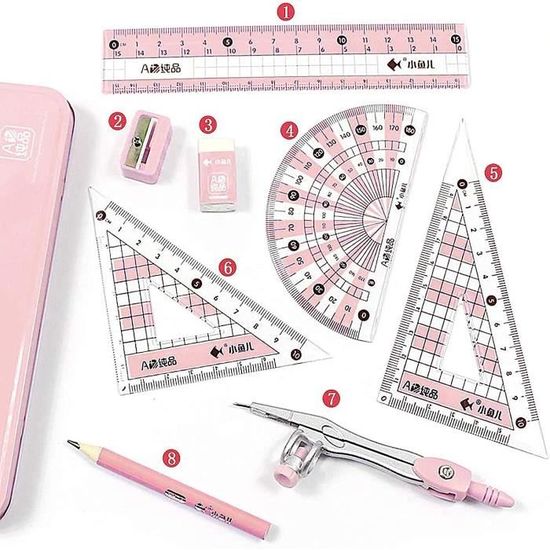 Kit de 8 pièces de géométrie mathématique, fournitures pour étudiants, règles, rapporteur, boussole, crayon, gomme, ensemble de papeterie Design élégant et pratique : avec ses accents roses et violets, cet ensemble est à la fois fonctionnel et accrocheur. Compas Staedtler 8 Pièces Ensemble Boussole Géométrique,Ensemble Compas Mathématiques,Ensembles Géométrie Pour L'École,Boussole, Règle, Rapporteur, Adapté à L'École, Bureau, Maison, Étudiants, Mathématiques Trousse Mathématiques 8 Pièces En raison de la mesure manuelle, il peut y avoir une légère erreur de taille et de poids. Convient pour les cours de géométrie, le dessin technique, les devoirs et la préparation aux examens. Un cadeau pratique pour un anniversaire, Noël ou la rentrée scolaire. Kit Geometrie Compass Ensemble de kit de géométrie mathématique, 8... Ensemble de 8 pièces de géométrie mathématique, compas de géométrie, boussole et rapporteur pour étudiants, mathématiques, cadeaux de papeterie pour enfants, rose Durable et fiable : fabriqués à partir de plastique et de métal de haute qualité, les outils sont robustes et durables. Idéal pour les étudiants et les enseignants : parfait pour les élèves du secondaire, les filles qui aiment les articles de papeterie mignons et les enseignants. En raison des différents écrans, il peut y avoir de légères différences de couleur.