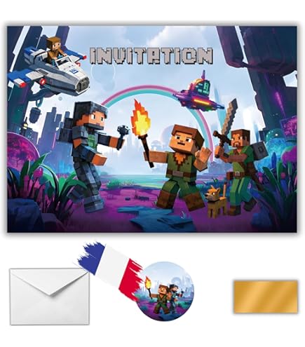 Nos cartons et enveloppes sont imaginés, conçus et imprimés en France, avec le plus grand soin. Découvrez notre vaste gamme de Minecraft 12 jeux d'invitations officiellement licenciées Minecraft avec enveloppes, cartes postales et autocollants Que ce soit pour un anniversaire, goûter, une fête ou une surprise à l'école, ces cartes s'adaptent à toutes les occasions. 🇫🇷 CONÇU ET IMPRIMÉ EN FRANCE - Cartons d'invitation de qualité française avec un soin particulier porté aux détails et à la finition. Parfait pour les fêtes d'anniversaire d'enfants, invitations à des goûters ou tout autre évènement festif. ✉️ 12 ENVELOPPES IMPRIMÉES POUR MINECRAFT – Impression intégrale recto verso sur l'enveloppe. Design unique thème garçon, pour émerveiller les invités au premier coup d'oeil. Byhsoep 12 Invitation Anniversaire Fille,Carte Invitation Papillon Avec... Cartons spécialement conçus pour les garçons de 3 à 12 ans fans de jeux video, gaming, univers Mine crafte, pixelisé, zombie, redstone, épées et diamants. roxisha - Lot de 10 Cartes Invitation Anniversaire Thème Minecraft Invitation Anniversaire Garcon Imprimez Gratuitement Des Cartes Dinvitation Danniversaire Minecraft Pour Une Fête Inoubliable Mario Party Switch 🎉 12 CARTONS D'INVITATION ANNIVERSAIRE OU AUTRE EVENNEMENT – Cartes avec coins arrondis pour Minecraft idéales pour fêtes et anniversaires enfants, garçons, jeunes ou adolescents de 3 à 12 ans fans de jeux vidéo, gaming et du film Mine Craft, Steve, portail, blocs pixel. Chaque pack contient : - 12 cartes d'invitation au format A6 (10,5 x 14,8 cm) - 12 enveloppes assorties en impression intégrale avec un autre design unique jeu vidéo et gaming pour Mine Craft Les cartes sont pré-remplies avec tous les champs essentiels (date, lieu, prénom, contact., ., ., ), pour faciliter l'organisation sans stress. Il ne vous reste plus qu'à compléter les informations à la main. Un vrai plaisir à tenir en main, et une belle surprise pour les invités. Ce pack est idéal pour les parents à la recherche d'une invitation enfant originale pour tout évènement.
